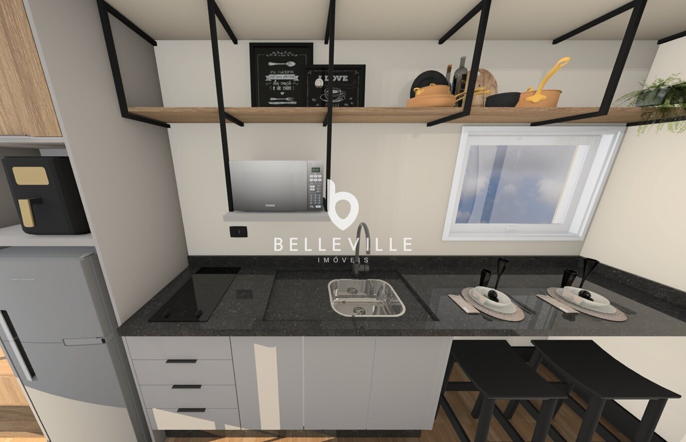 Cozinha equipada com geladeira, cooktop, micro-ondas e utensílios básicos