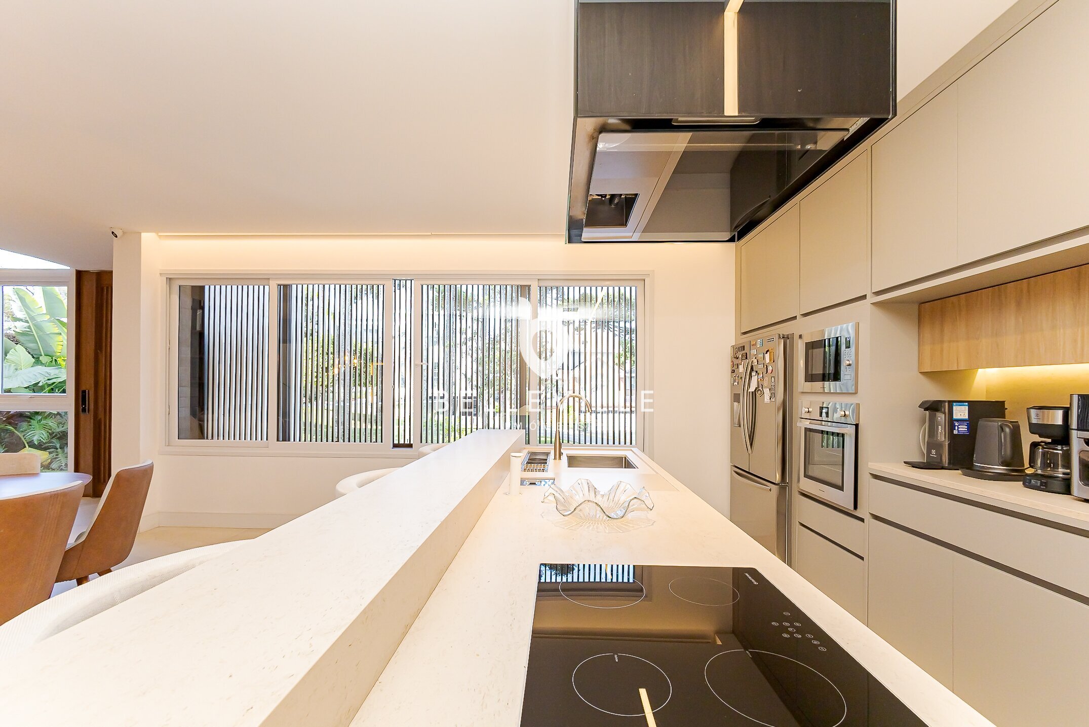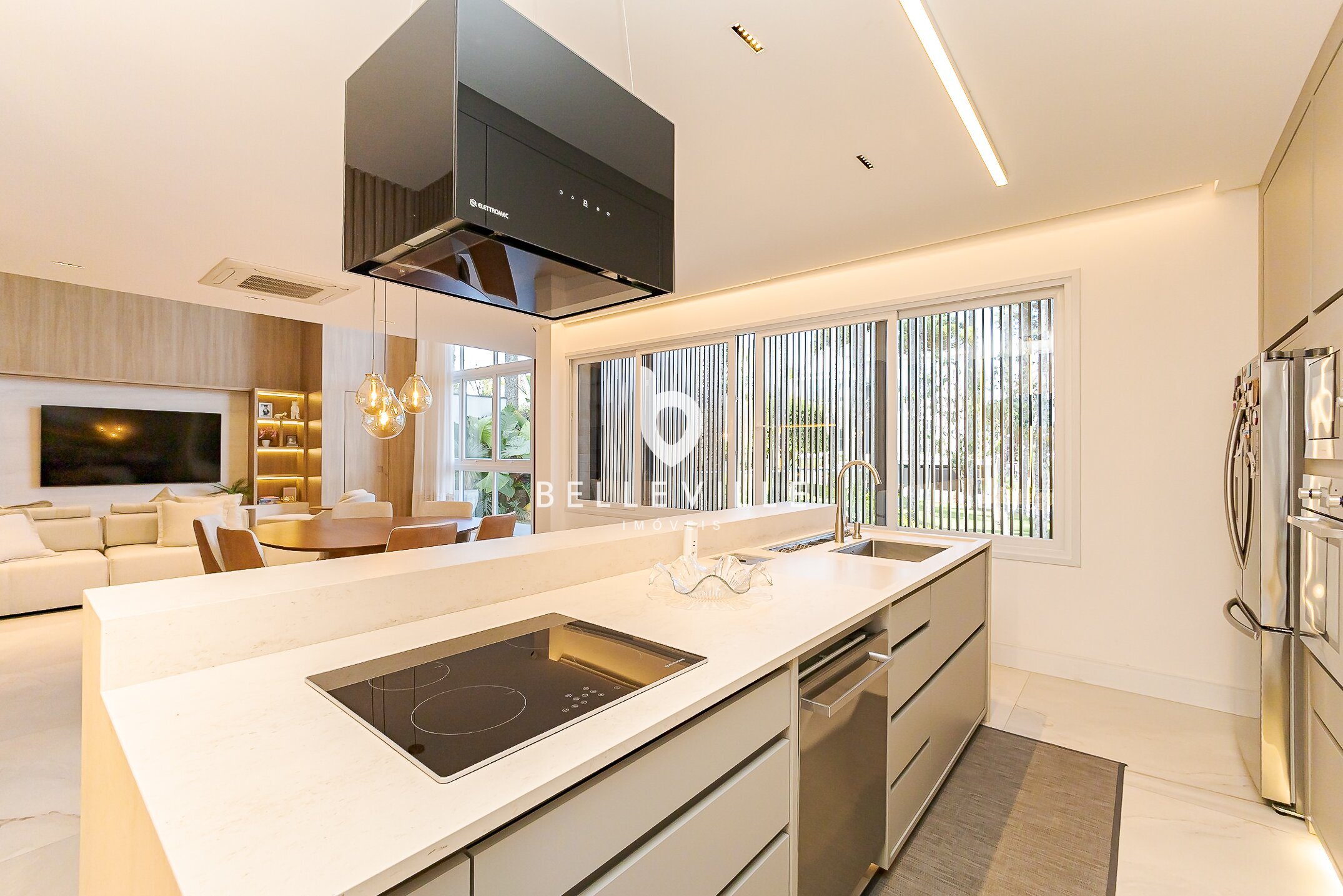 Cozinha gourmet com ilha integrada à sala de jantar e estar, em conceito aberto, equipada com eletrodomésticos Eletromec.