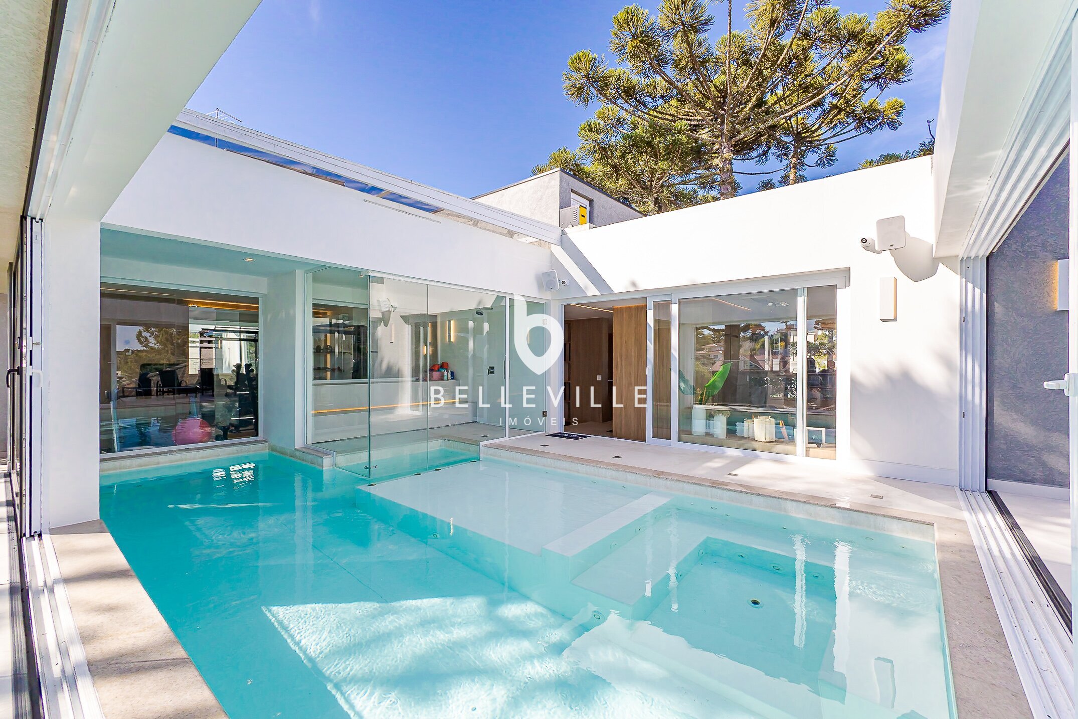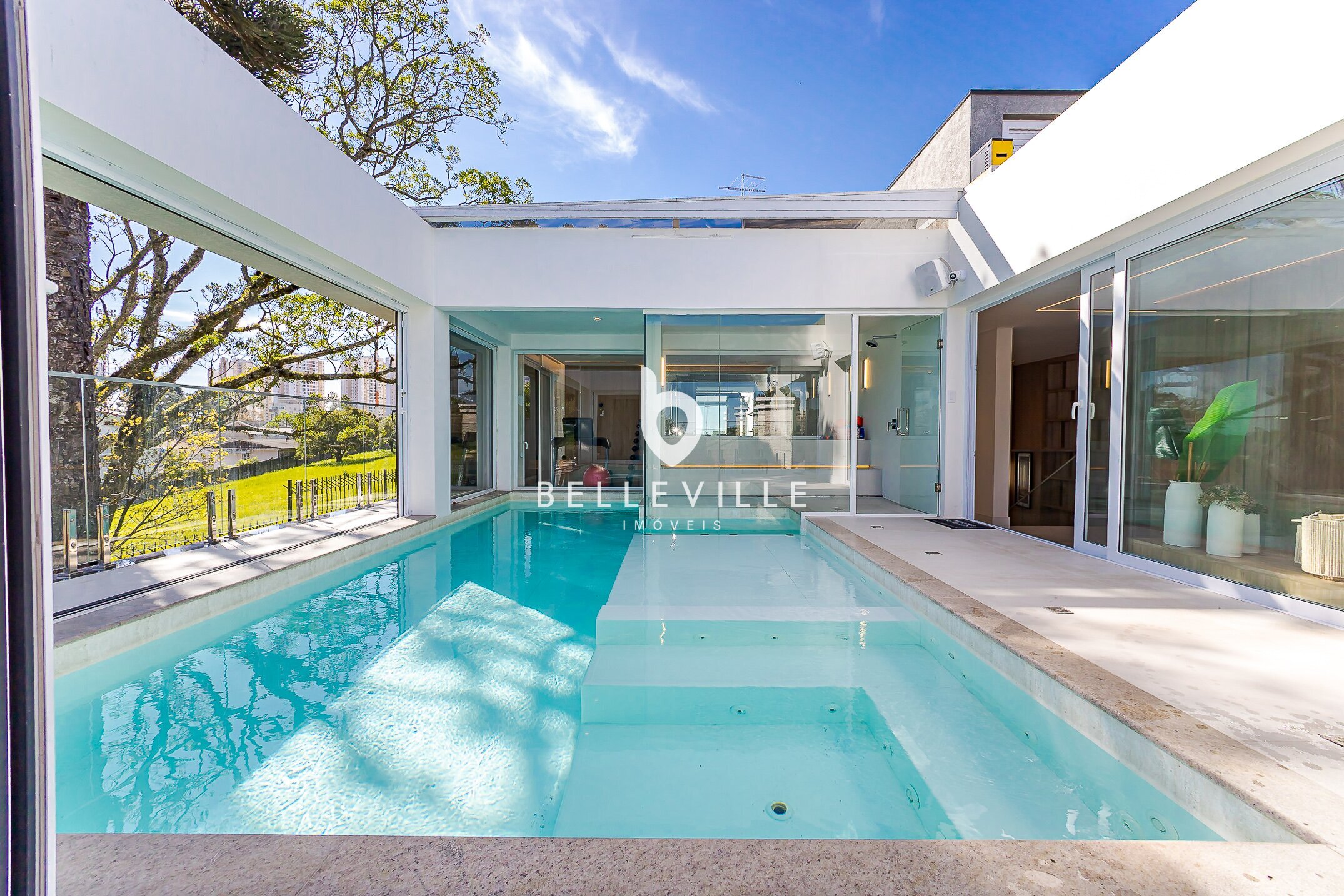 Piscina aquecida com cascata, cercada por vidros retráteis, para uso em qualquer estação.