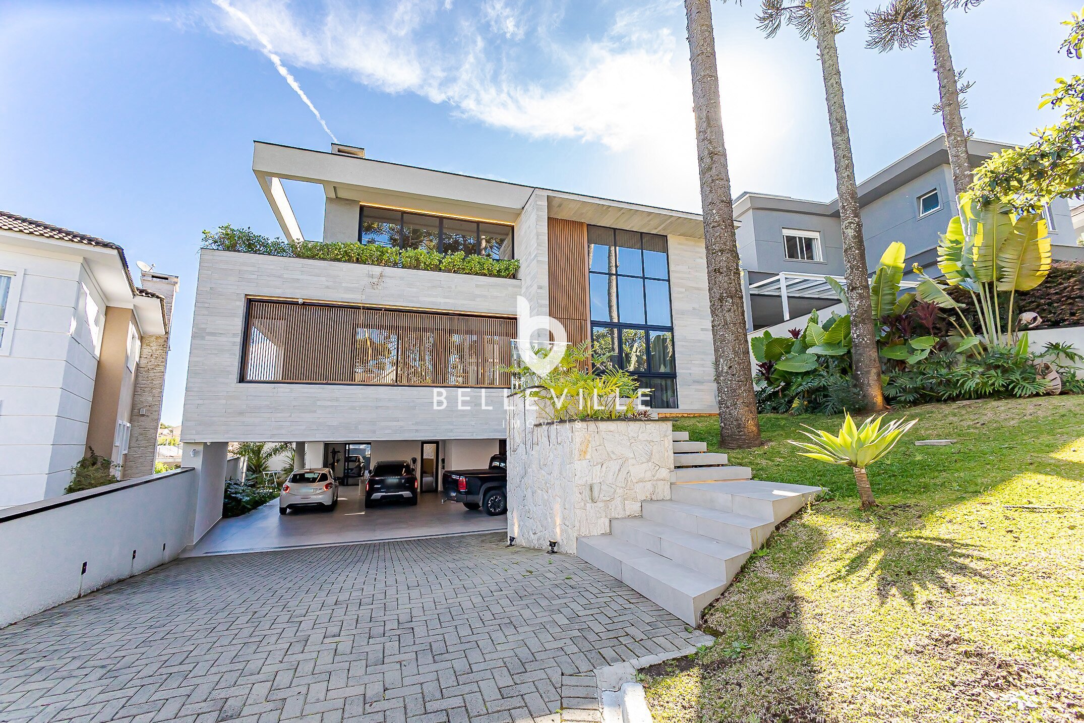 Garagem para até 7 carros, com ponto de recarga para veículo elétrico.