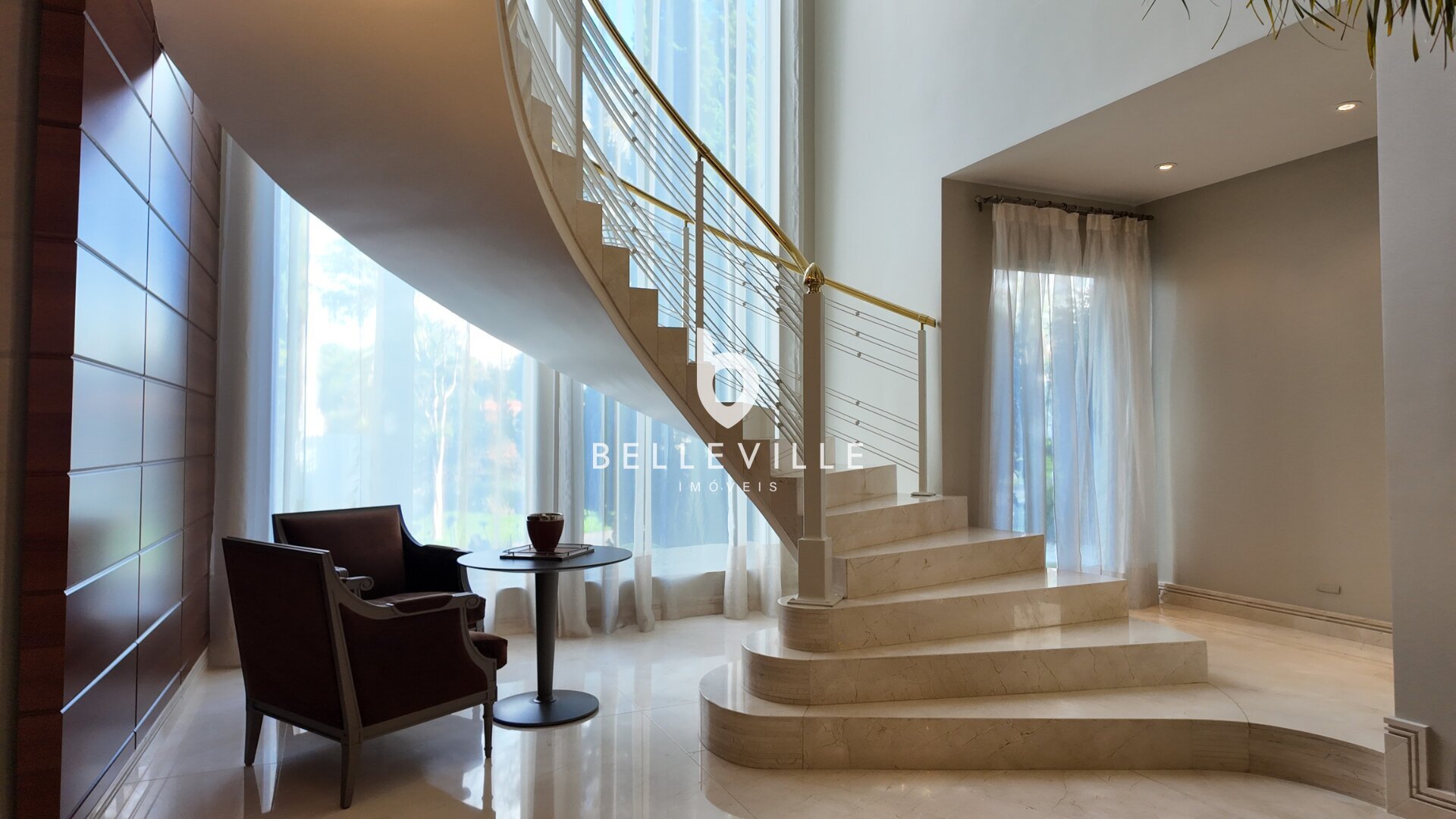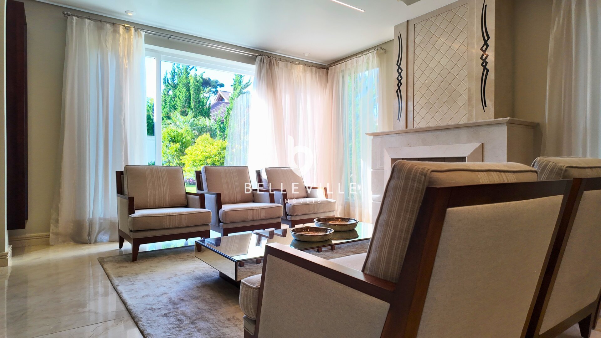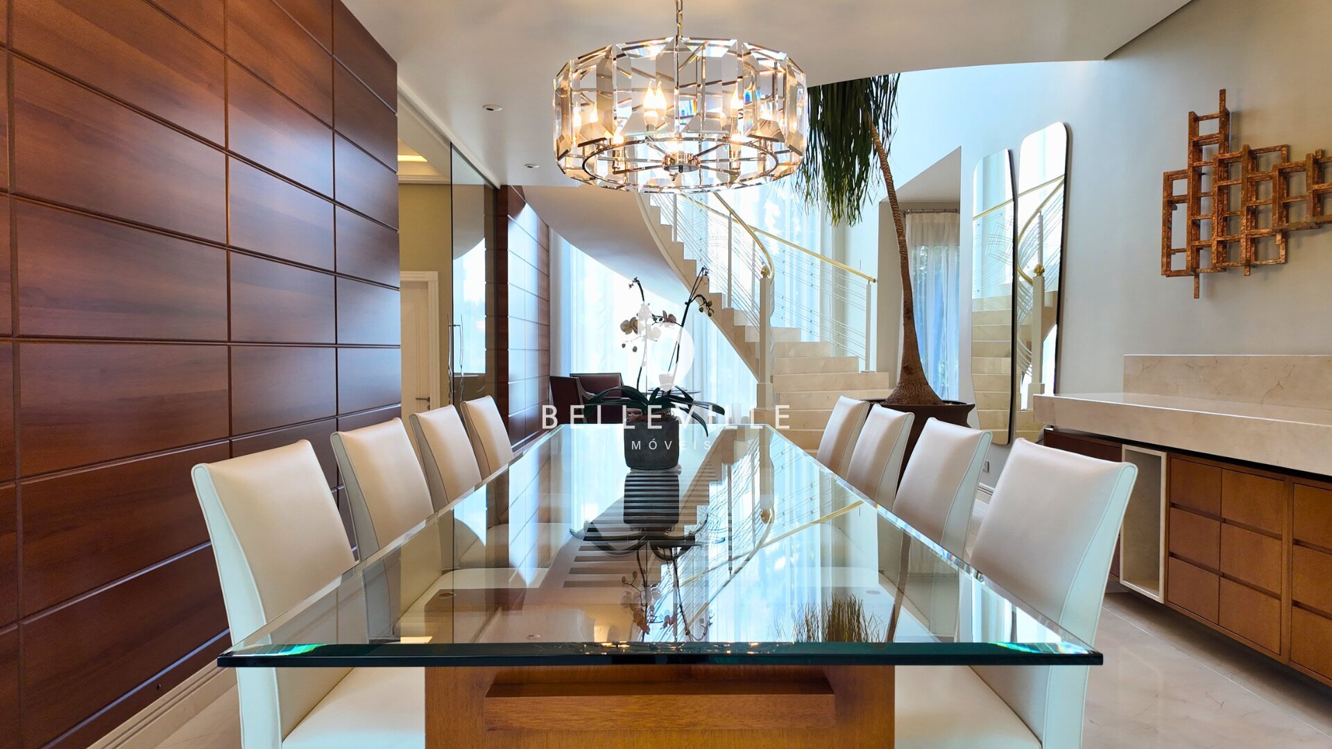 Ao entrar, você é recebido por uma sala de estar para dois ambientes, com lareira a lenha, integrada a uma elegante sala de jantar marcada por uma escada escultura e pé-direito duplo que impressiona. O piso em mármore crema marfil reforça o charme do ambiente, complementado por mobiliário Artefacto e planejados Kitchens, trazendo equilíbrio perfeito entre luxo e funcionalidade.