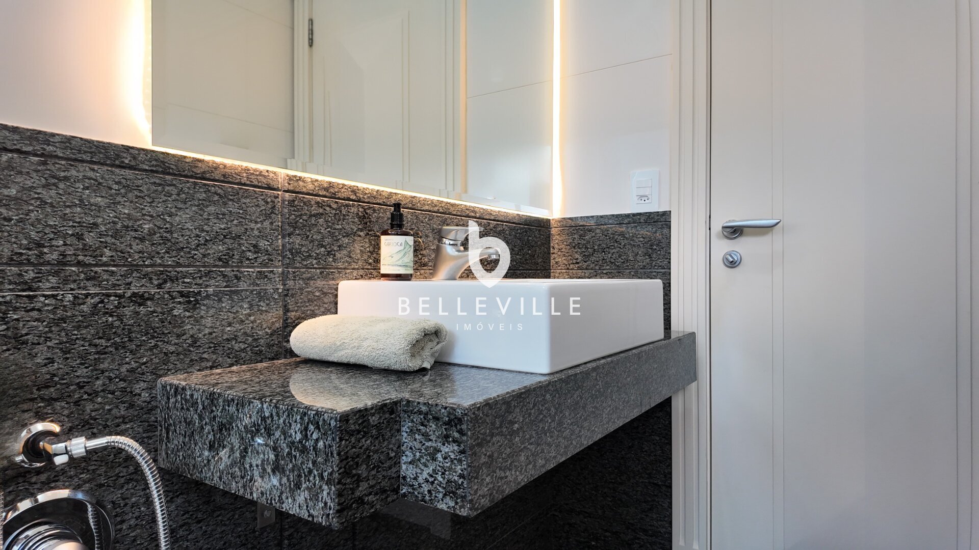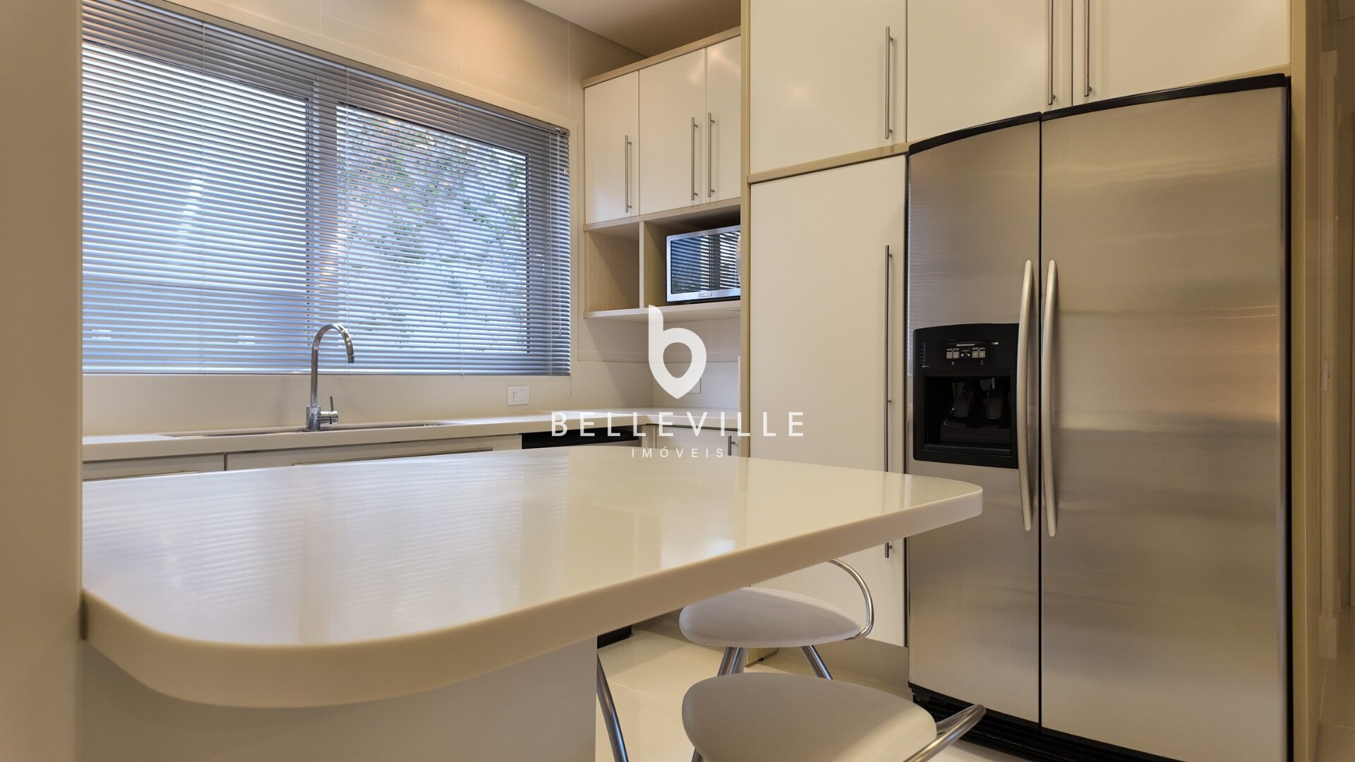 A cozinha completa, com eletrodomésticos de alto padrão e tampo em corian, é impecável. Conta ainda com despensa, área de serviço também equipada, além de quarto e banheiro de apoio.