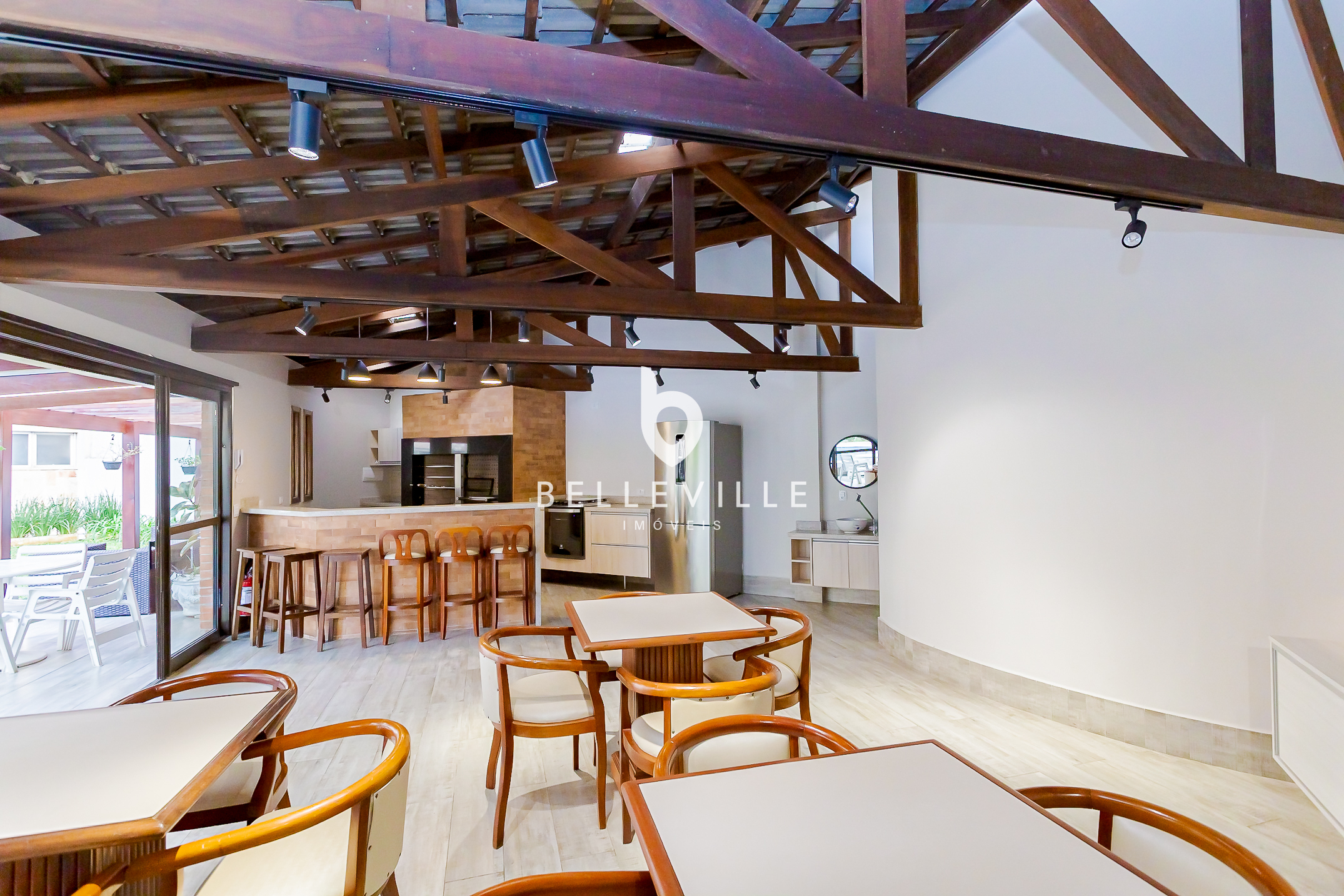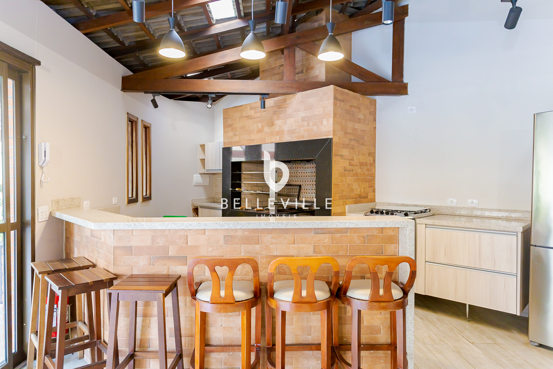 Salão gourmet com churrasqueira a carvão;
