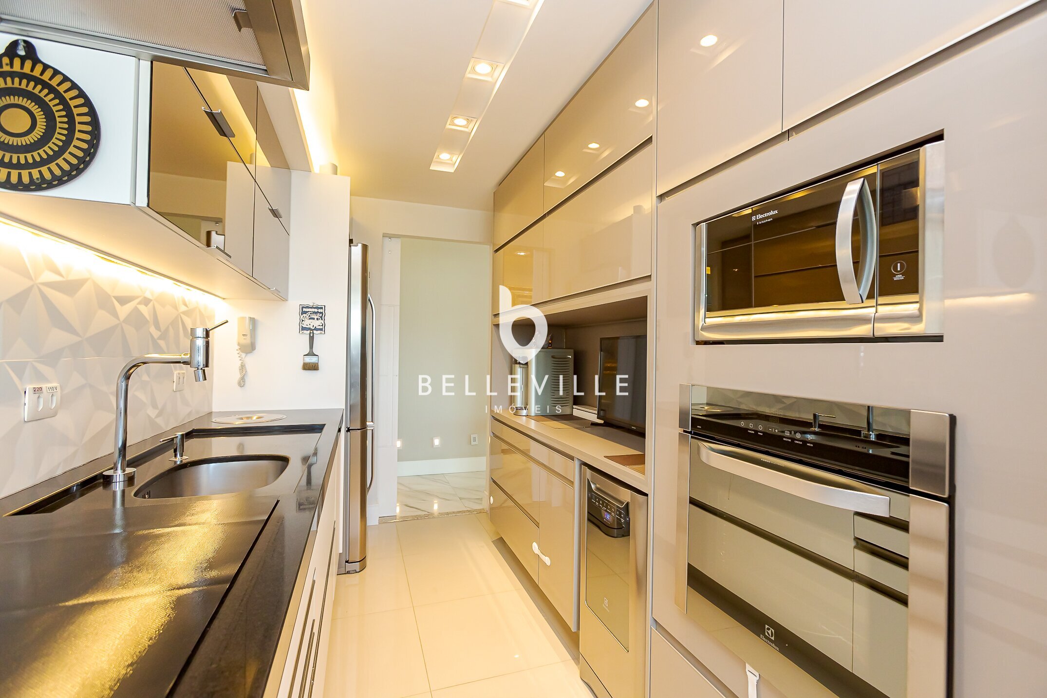 A cozinha planejada, com armários sob medida, é prática e acolhedora, perfeita para as refeições do dia a dia.
