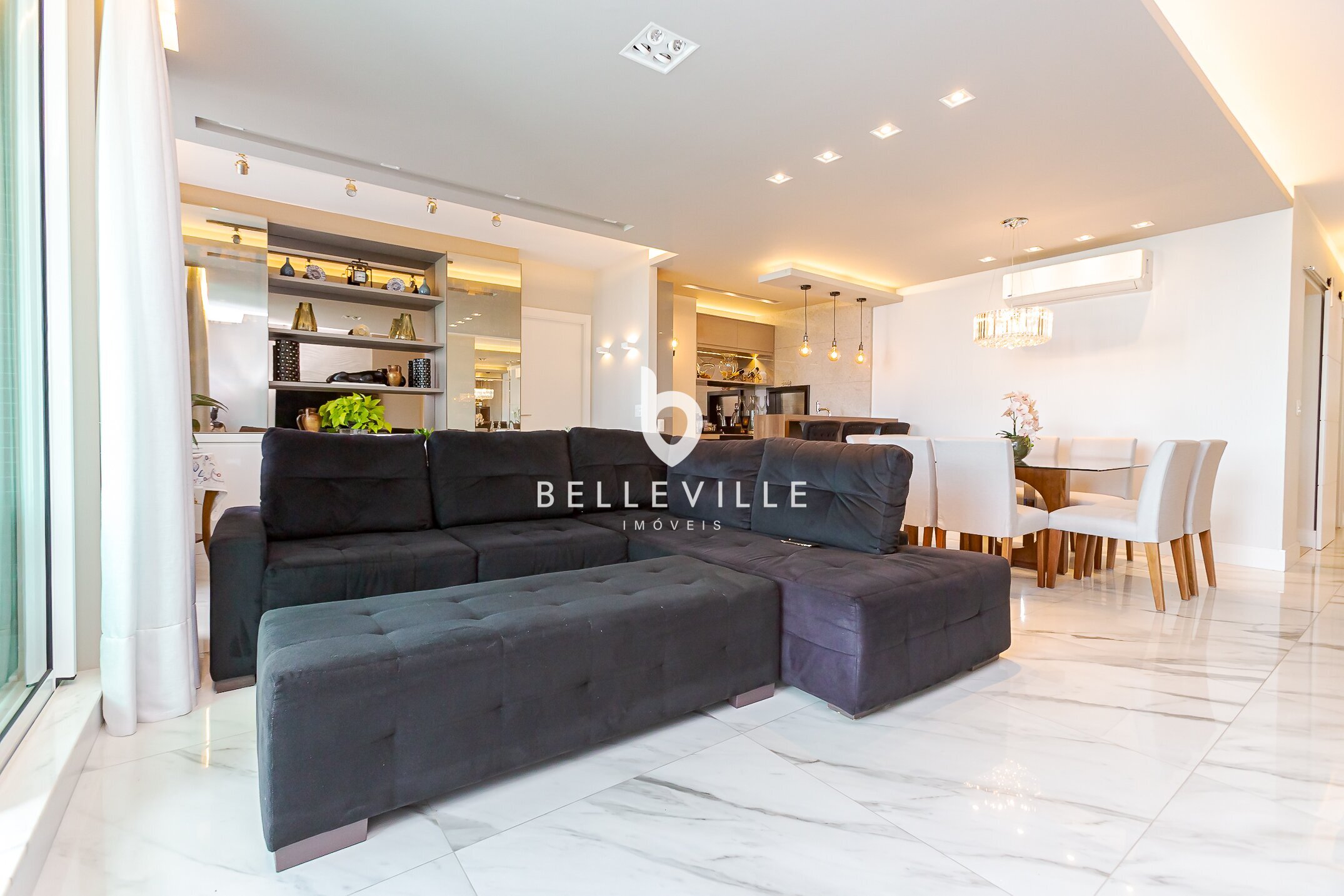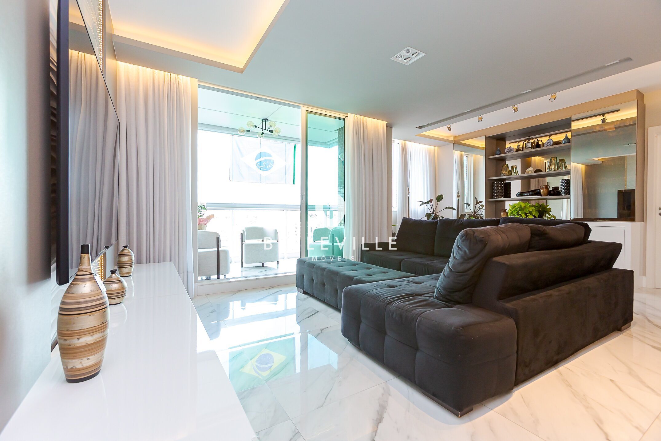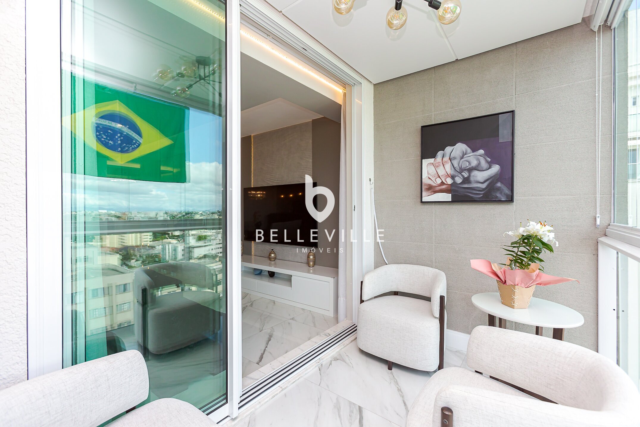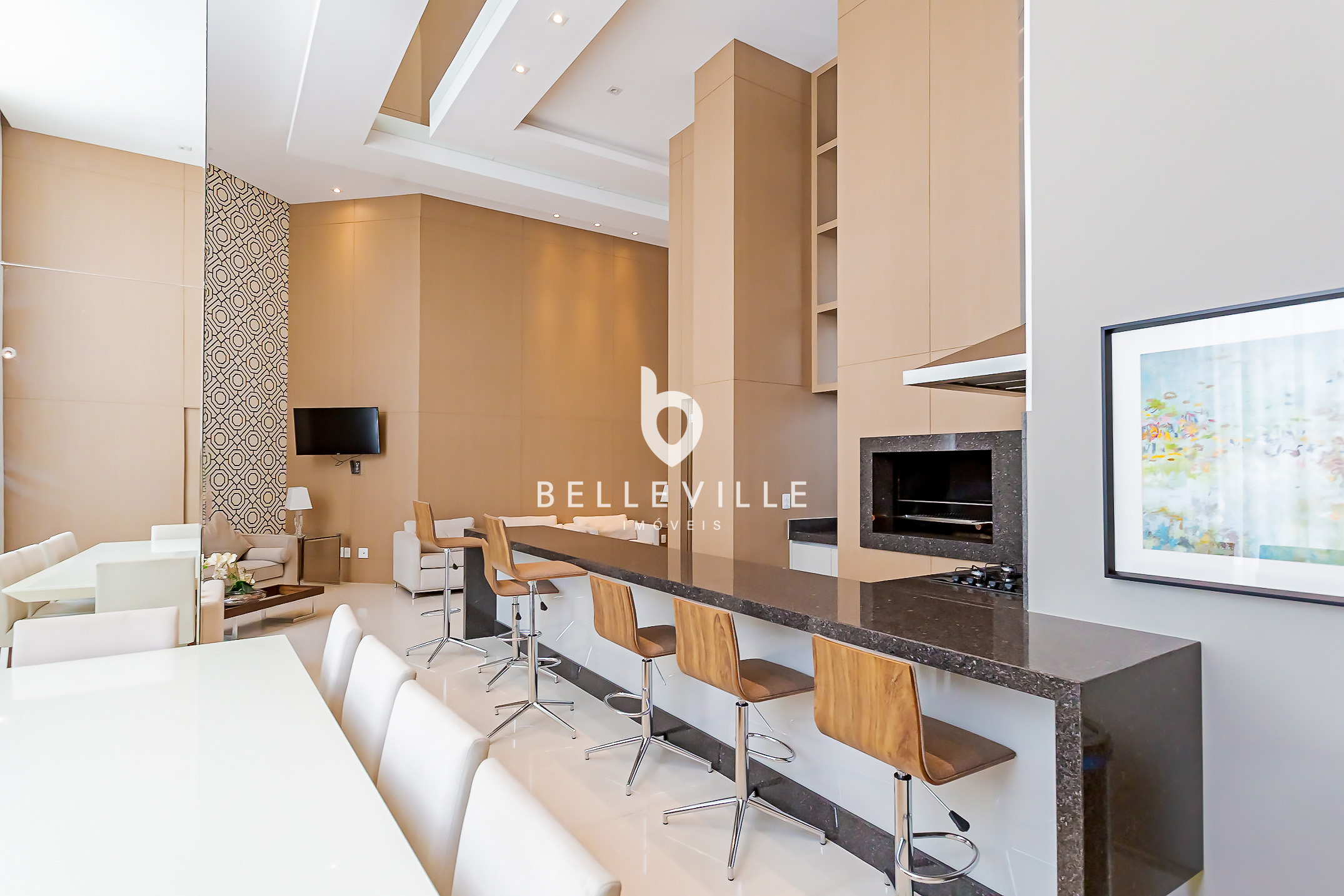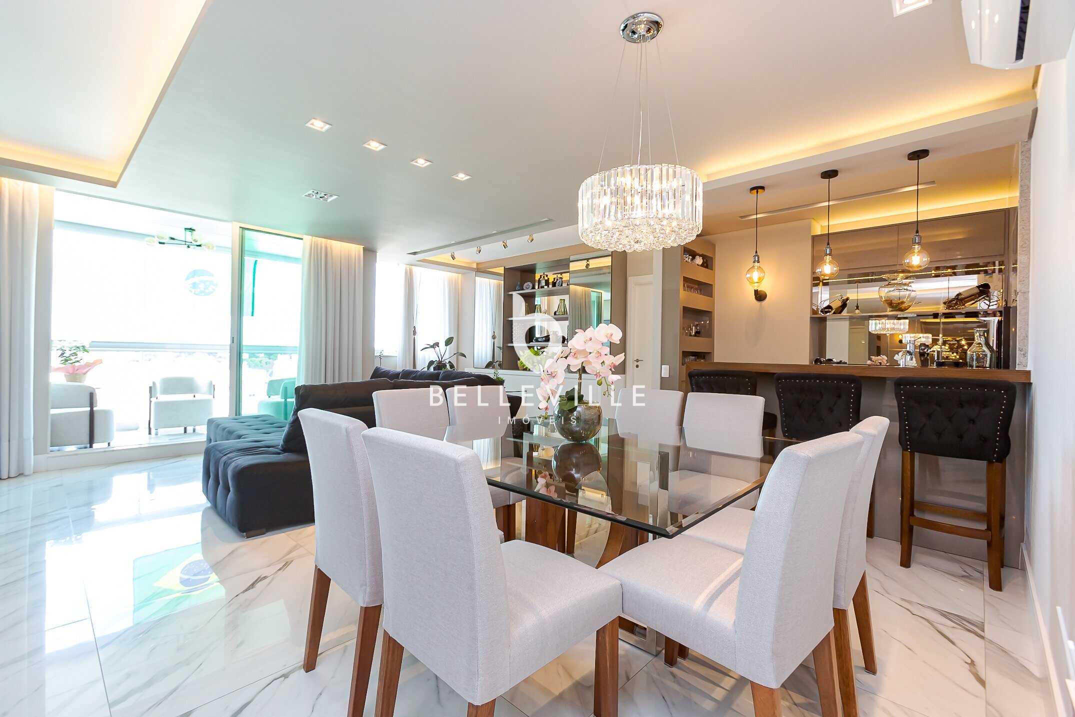 A sala de estar é ampla e integrada à varanda gourmet, com churrasqueira e vista definida — o espaço ideal para bons momentos de descontração.