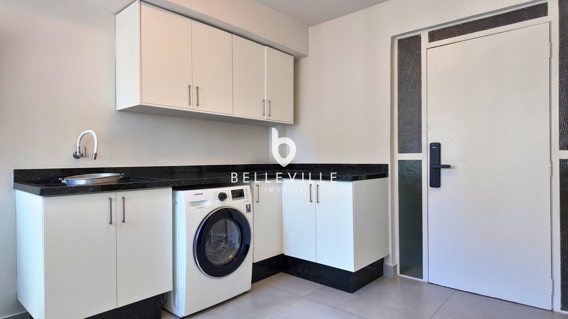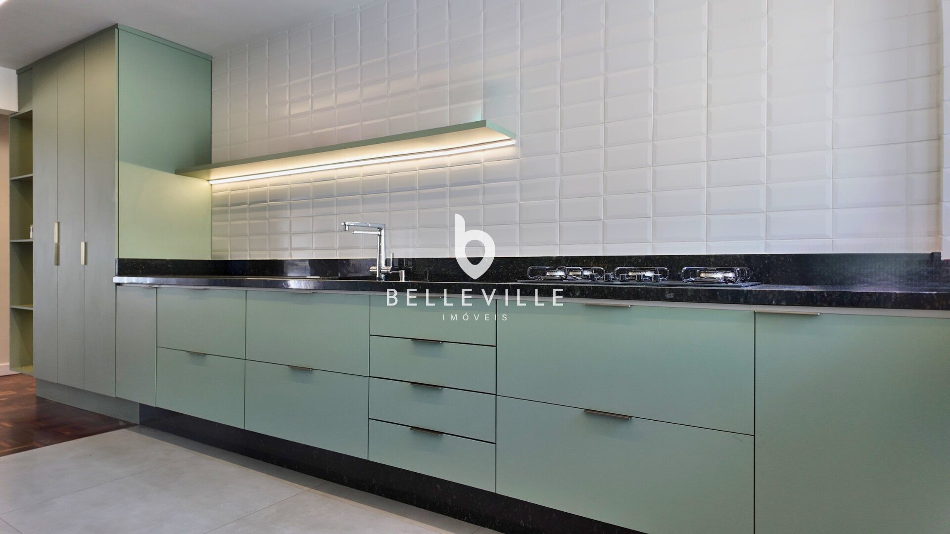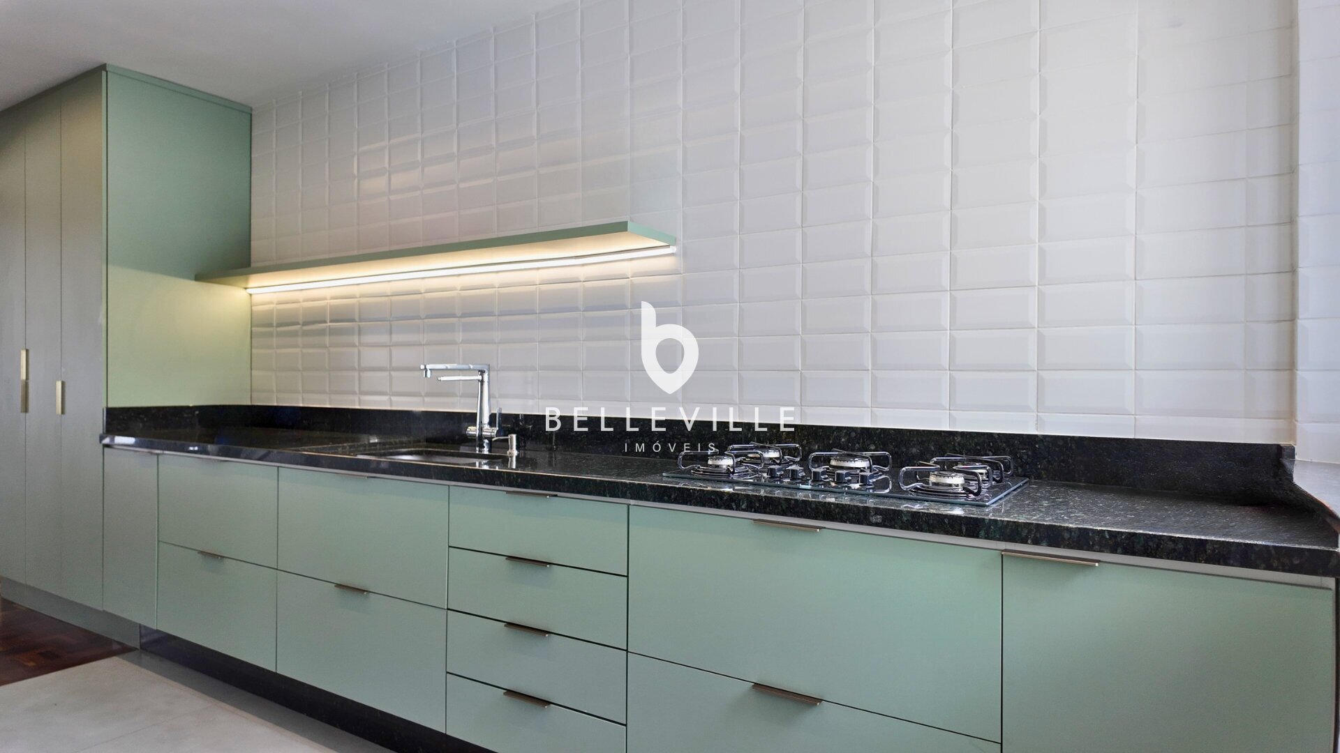 A área social é um convite à convivência: sala de estar ampla, sala de jantar e uma charmosa cozinha equipada com armários planejados de excelente bom gosto. O belíssimo piso de madeira original é um dos destaques que reforça o caráter acolhedor e sofisticado do imóvel.