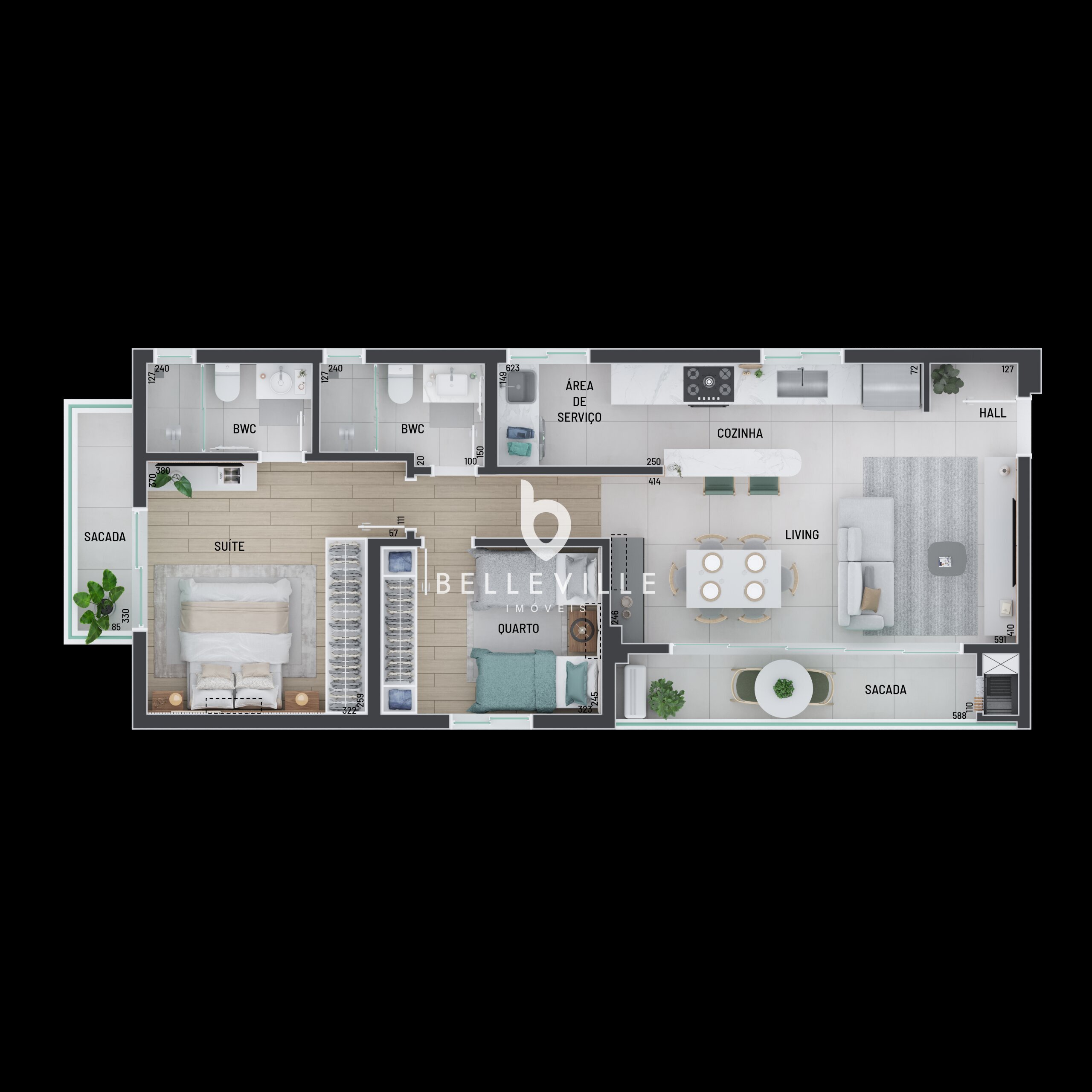 2 dormitórios, sendo 1 suíte;