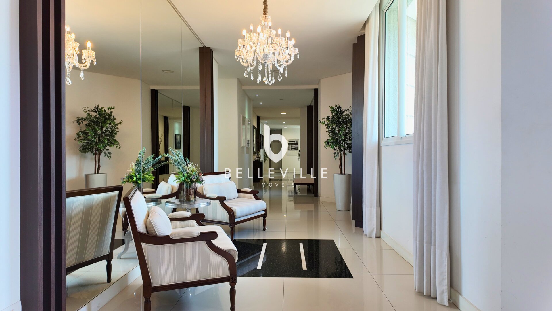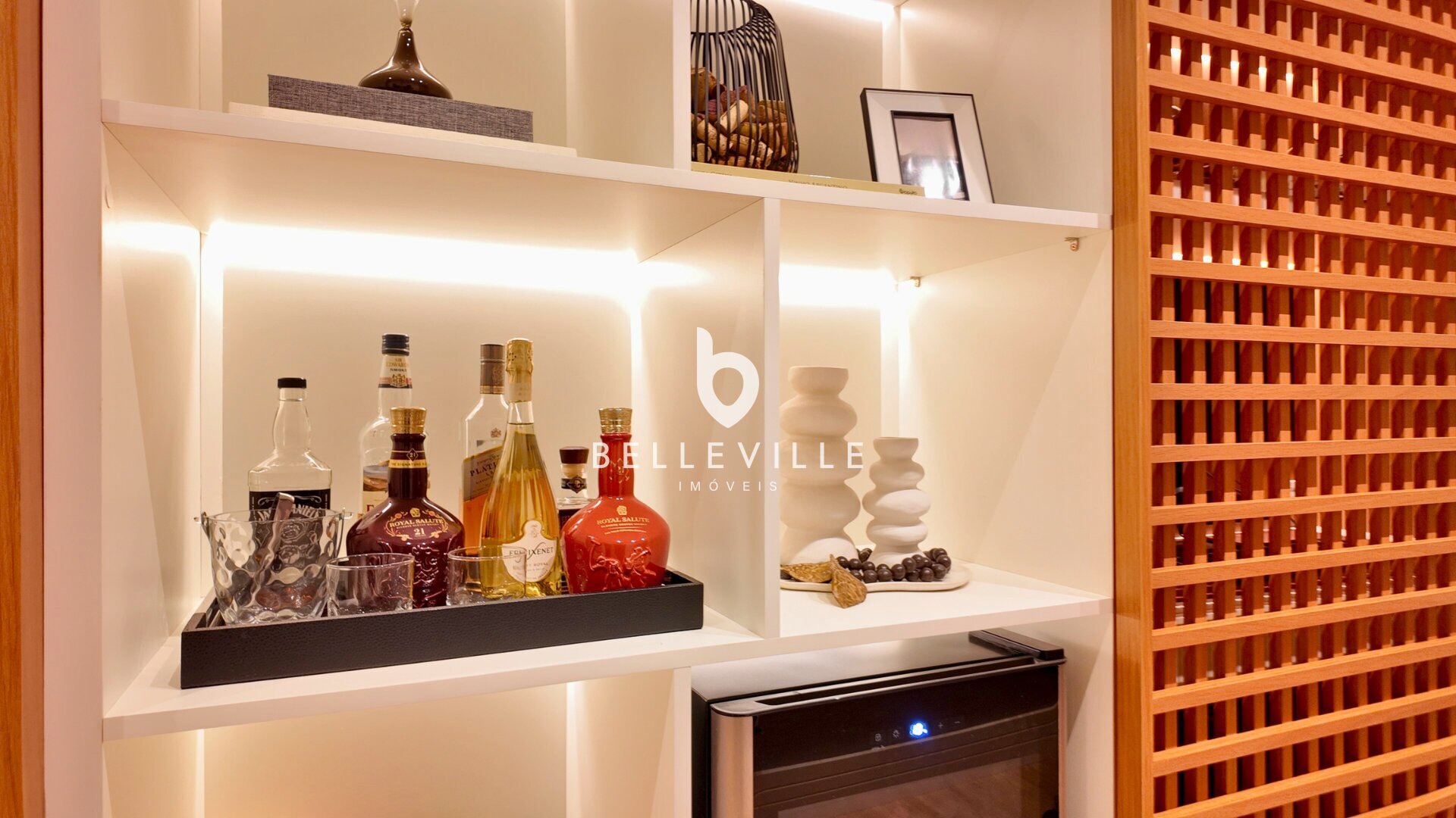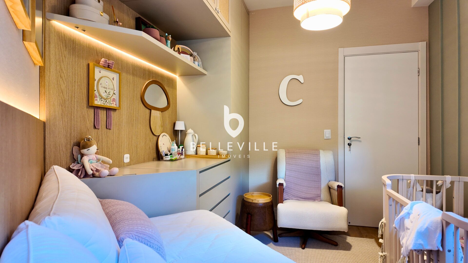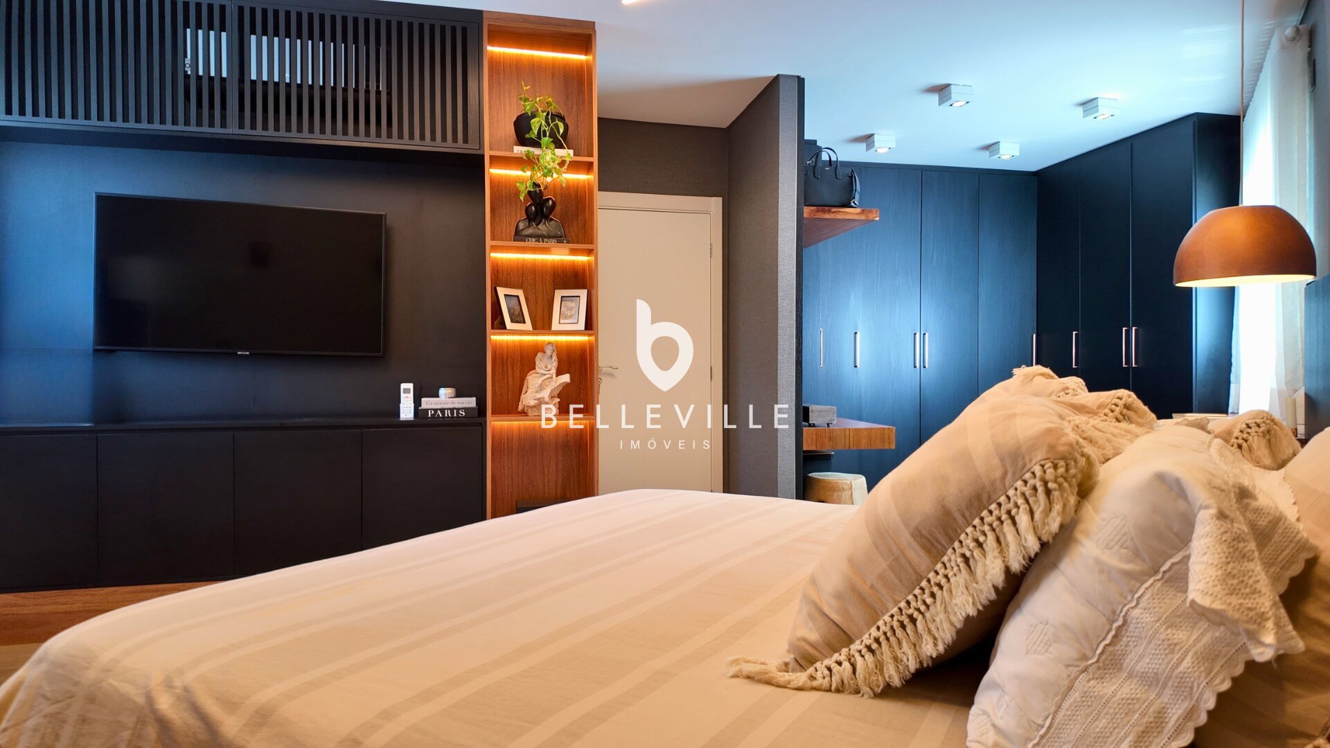 Totalmente mobiliado e com um projeto de interiores pensado para o dia a dia, o imóvel hoje conta com dois dormitórios, sendo uma suíte ampla com espaço para closet. A planta original previa três quartos e permite reversão, caso haja necessidade.