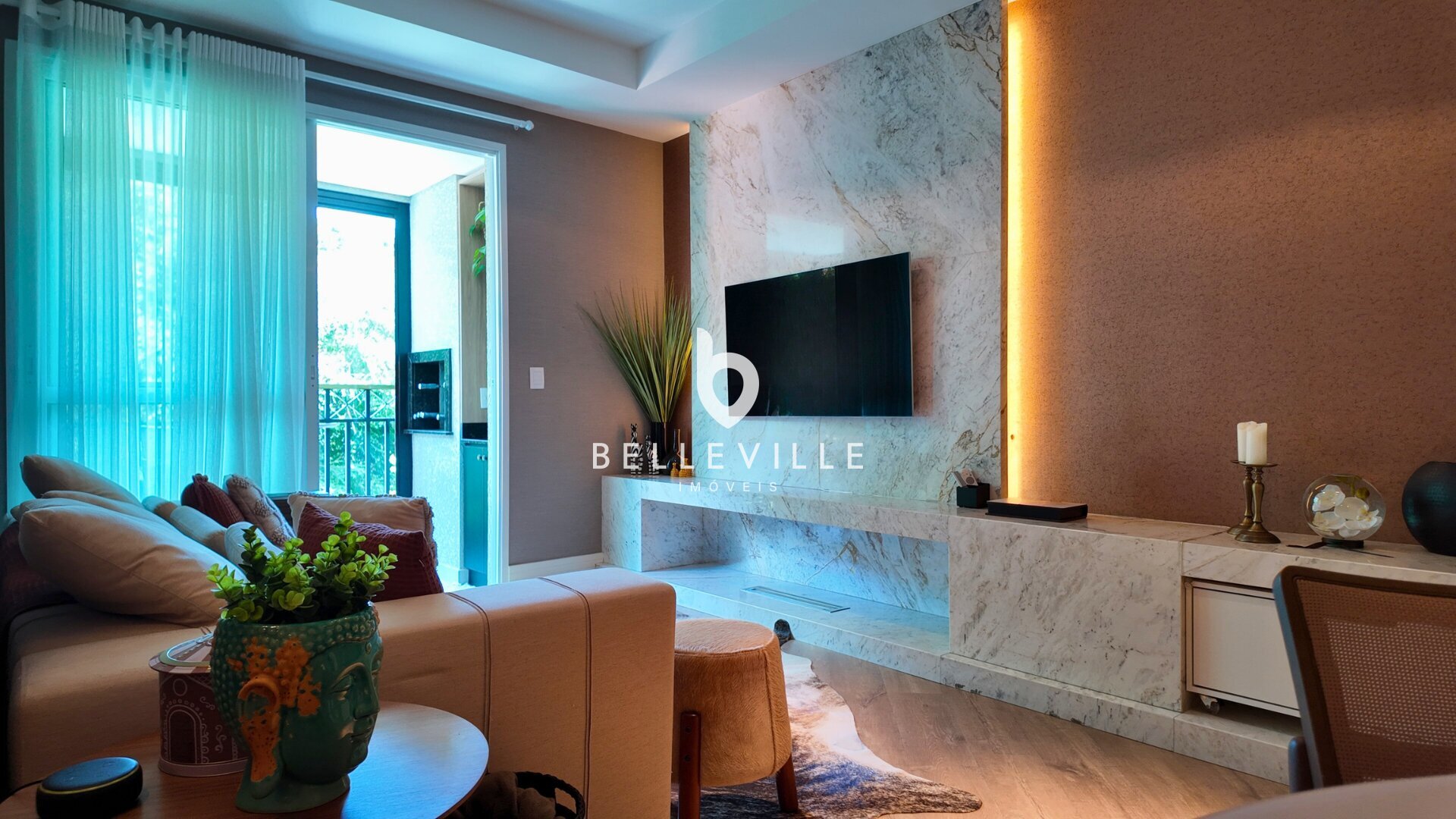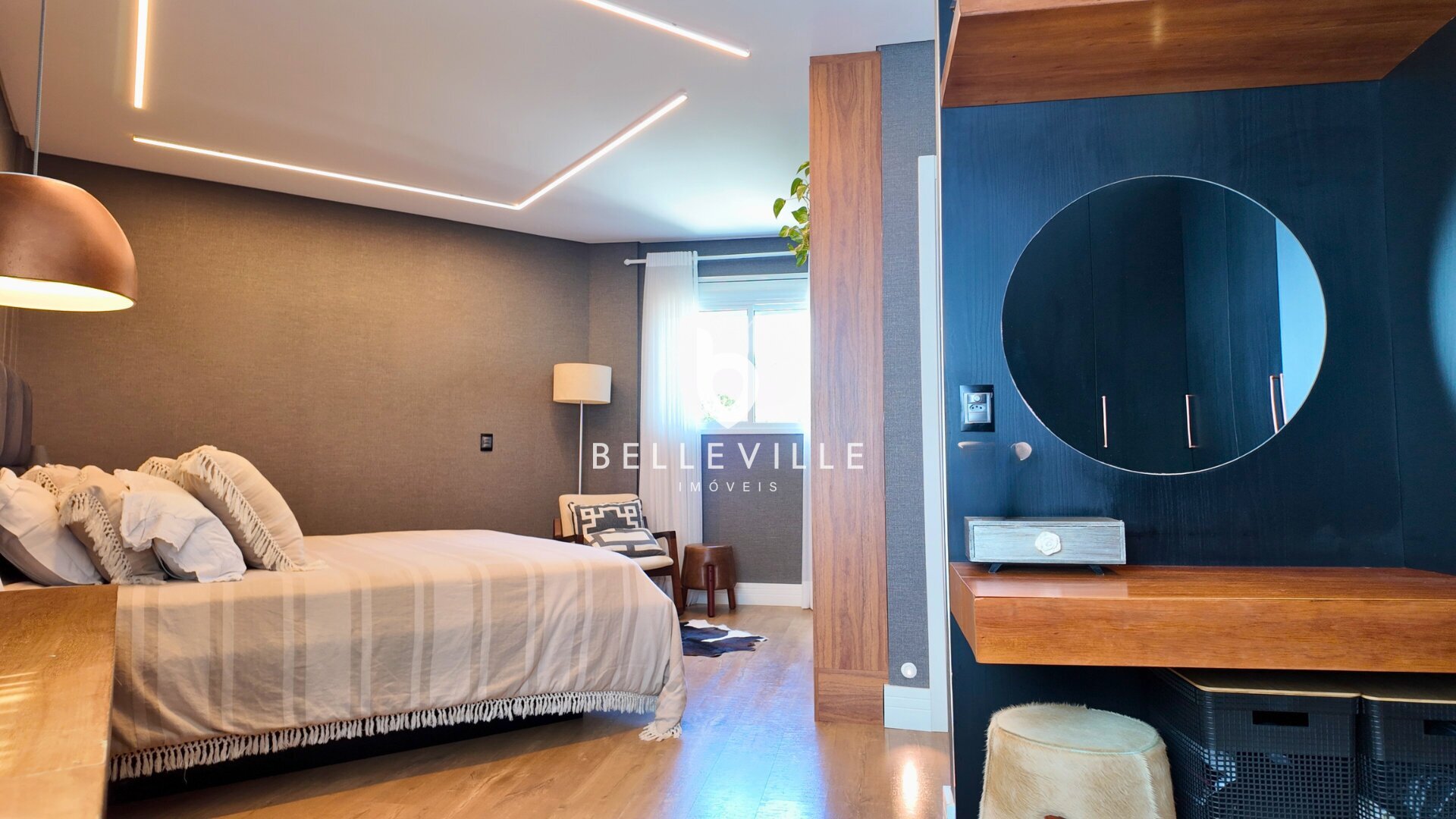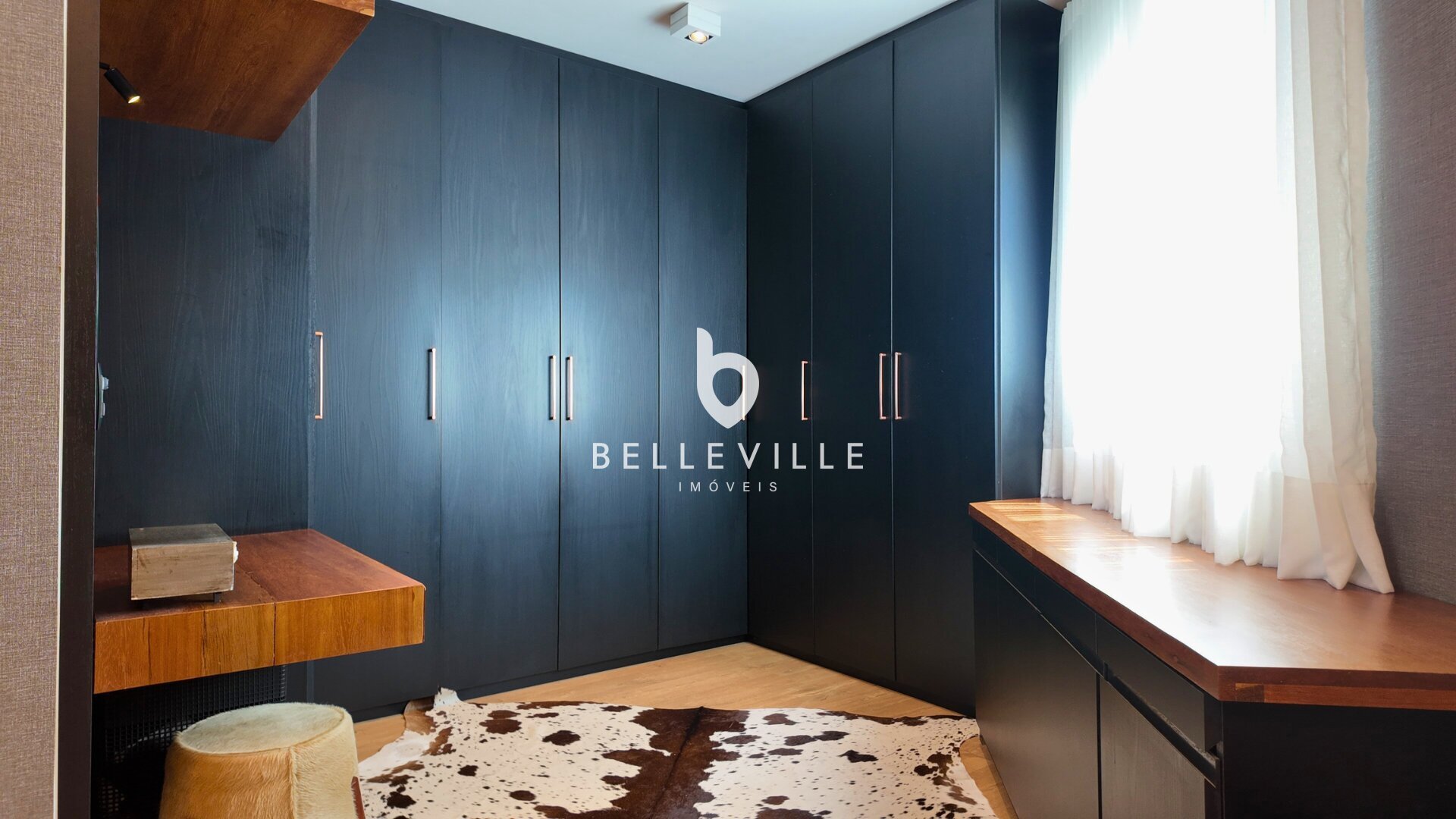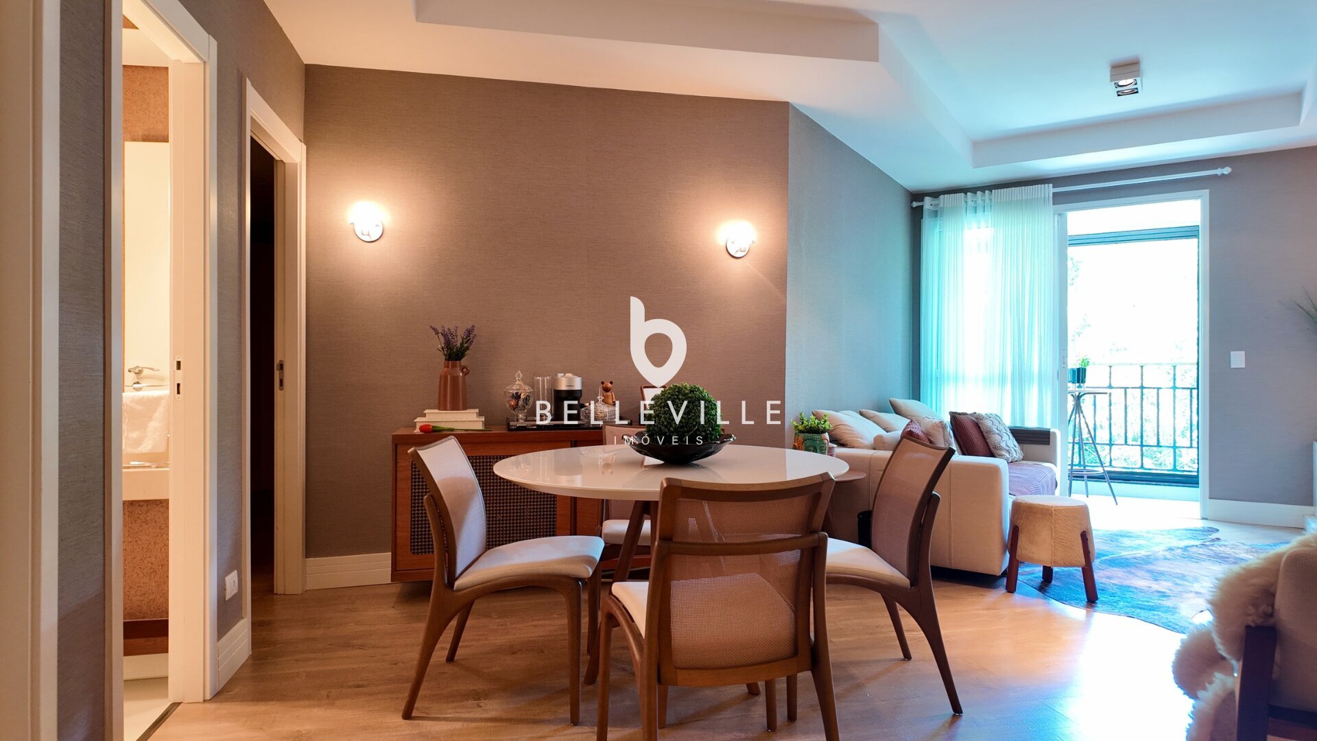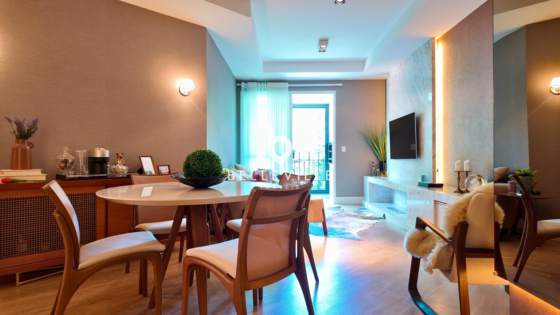 Totalmente mobiliado e com um projeto de interiores pensado para o dia a dia, o imóvel hoje conta com dois dormitórios, sendo uma suíte ampla com espaço para closet. A planta original previa três quartos e permite reversão, caso haja necessidade.
