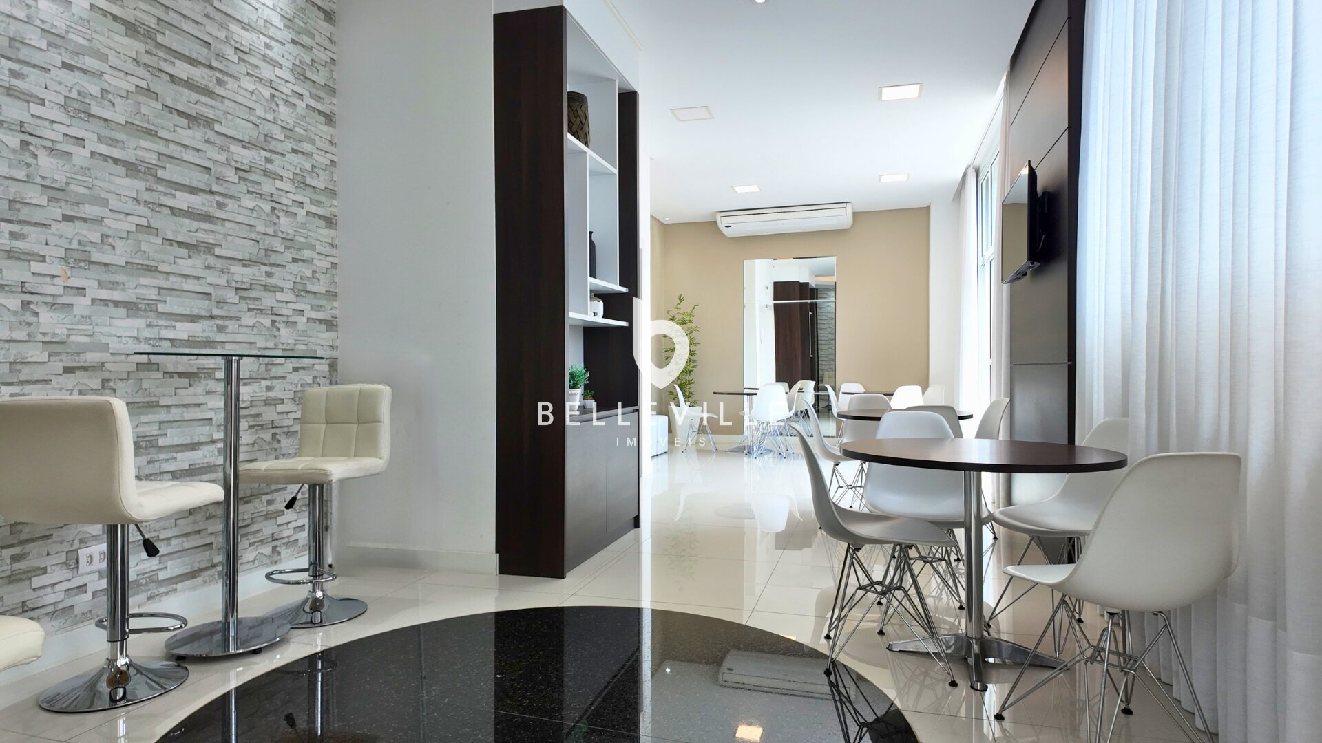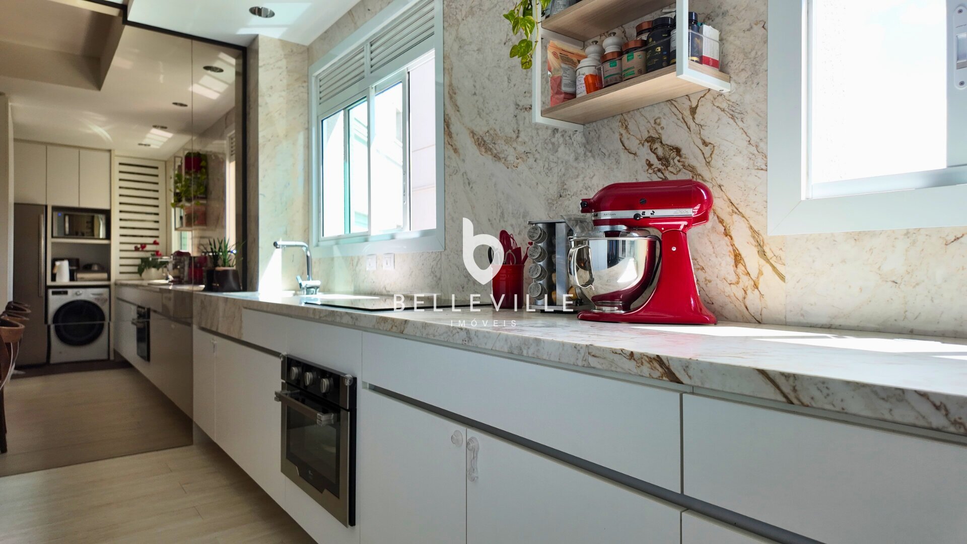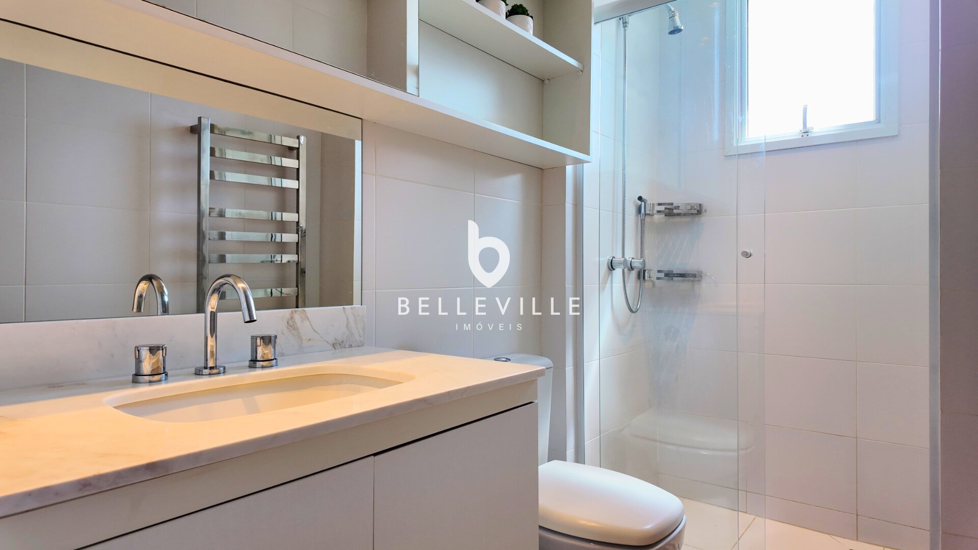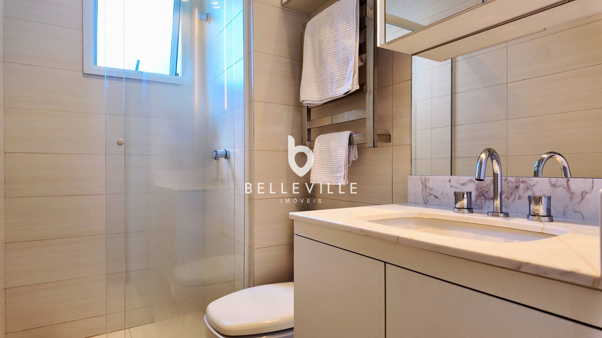 Totalmente mobiliado e com um projeto de interiores pensado para o dia a dia, o imóvel hoje conta com dois dormitórios, sendo uma suíte ampla com espaço para closet. A planta original previa três quartos e permite reversão, caso haja necessidade.