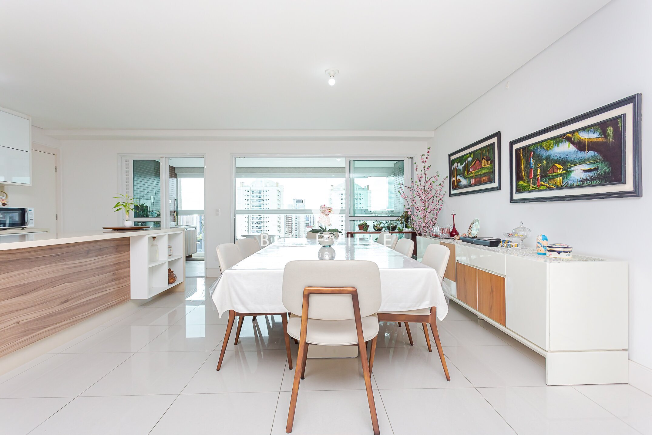 Espaço de jantar para até 10 pessoas, com layout que valoriza a integração dos ambientes;