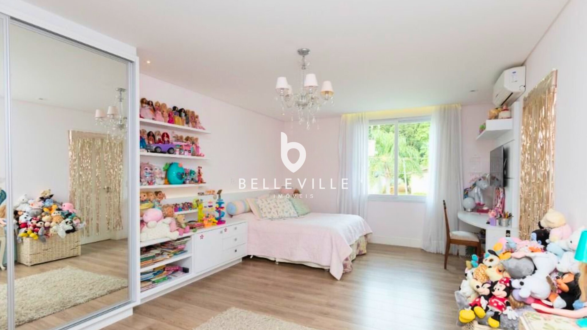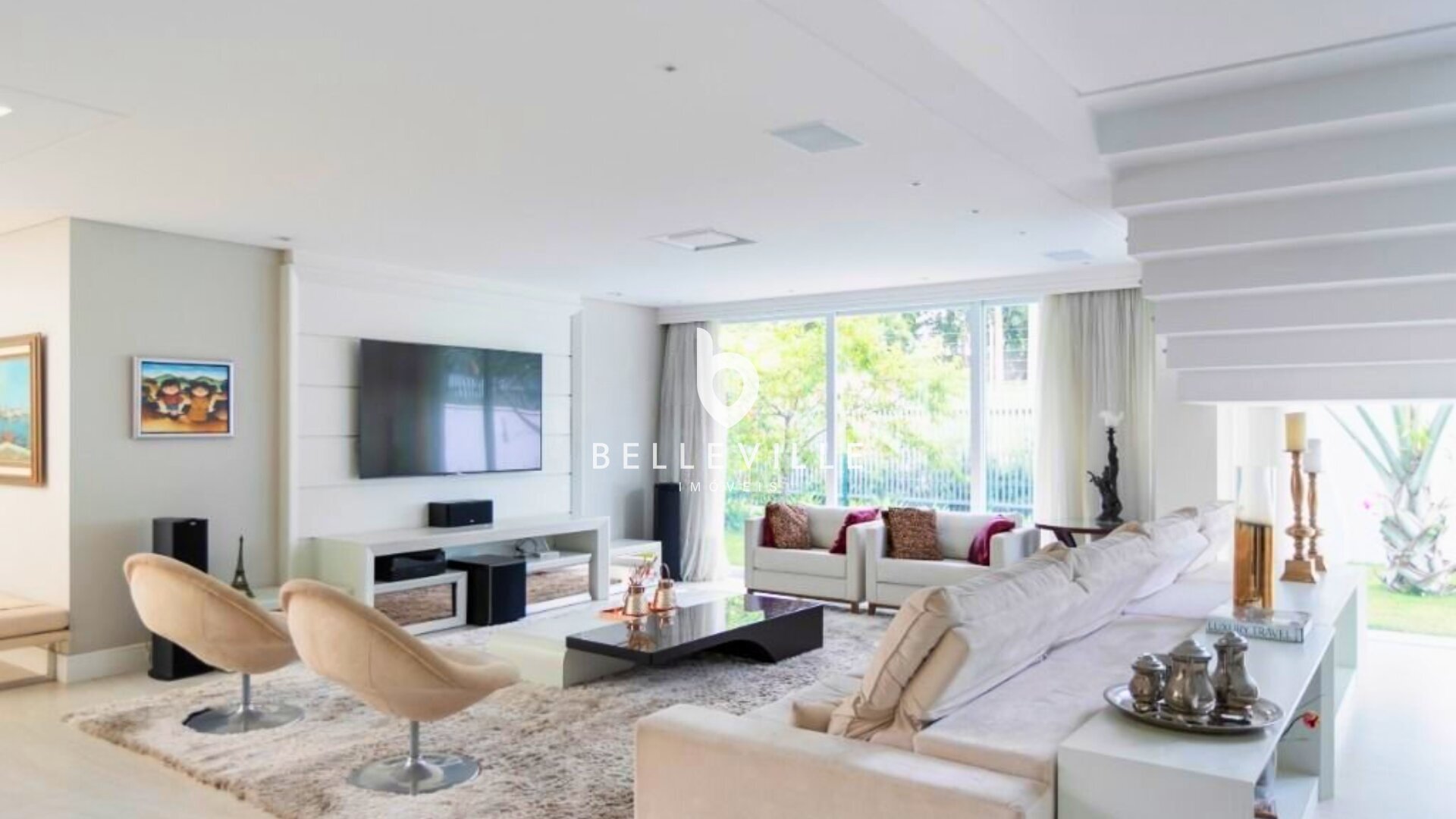 A residência ainda oferece cozinha com móveis planejados, lavanderia completa e garagem para até cinco veículos.