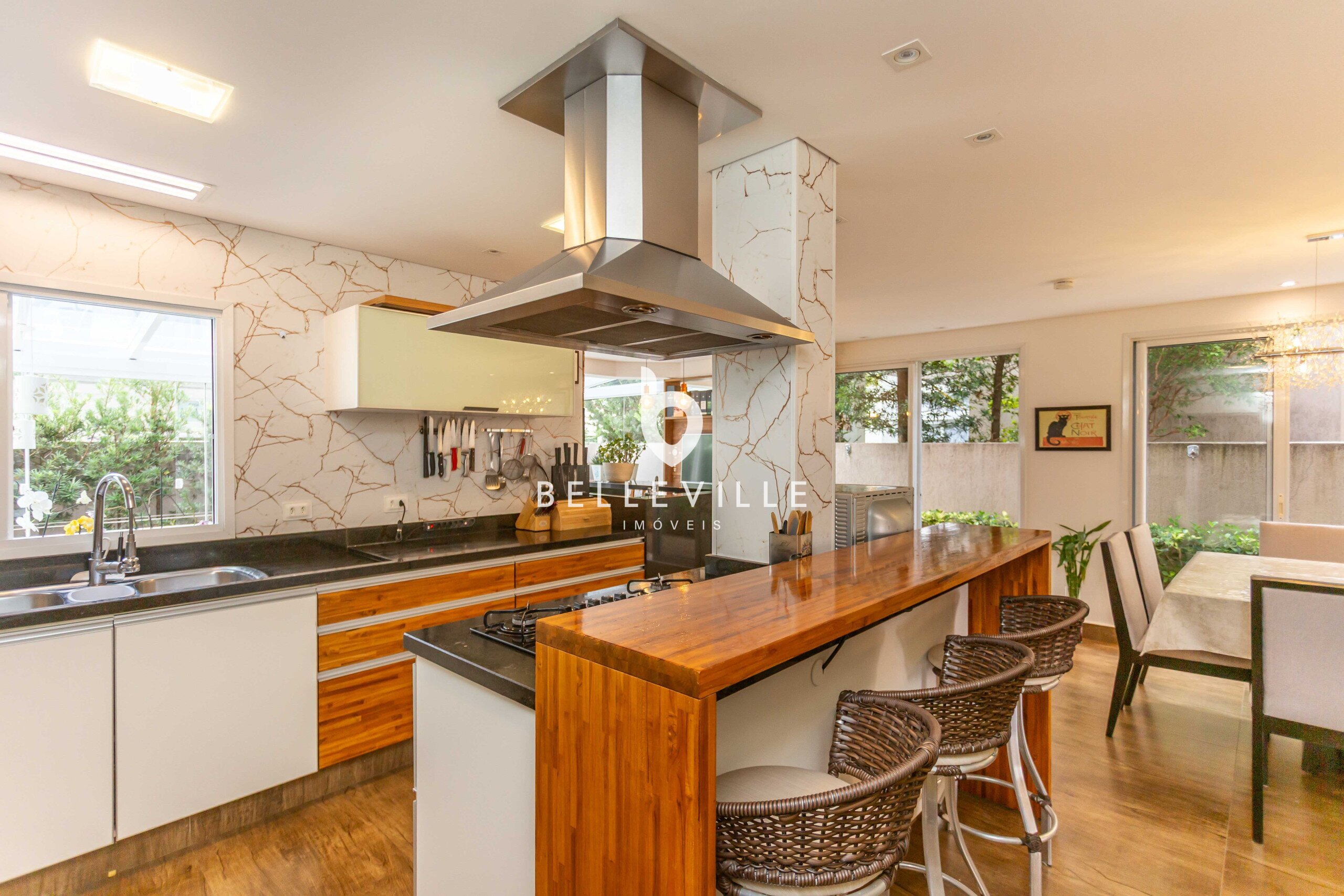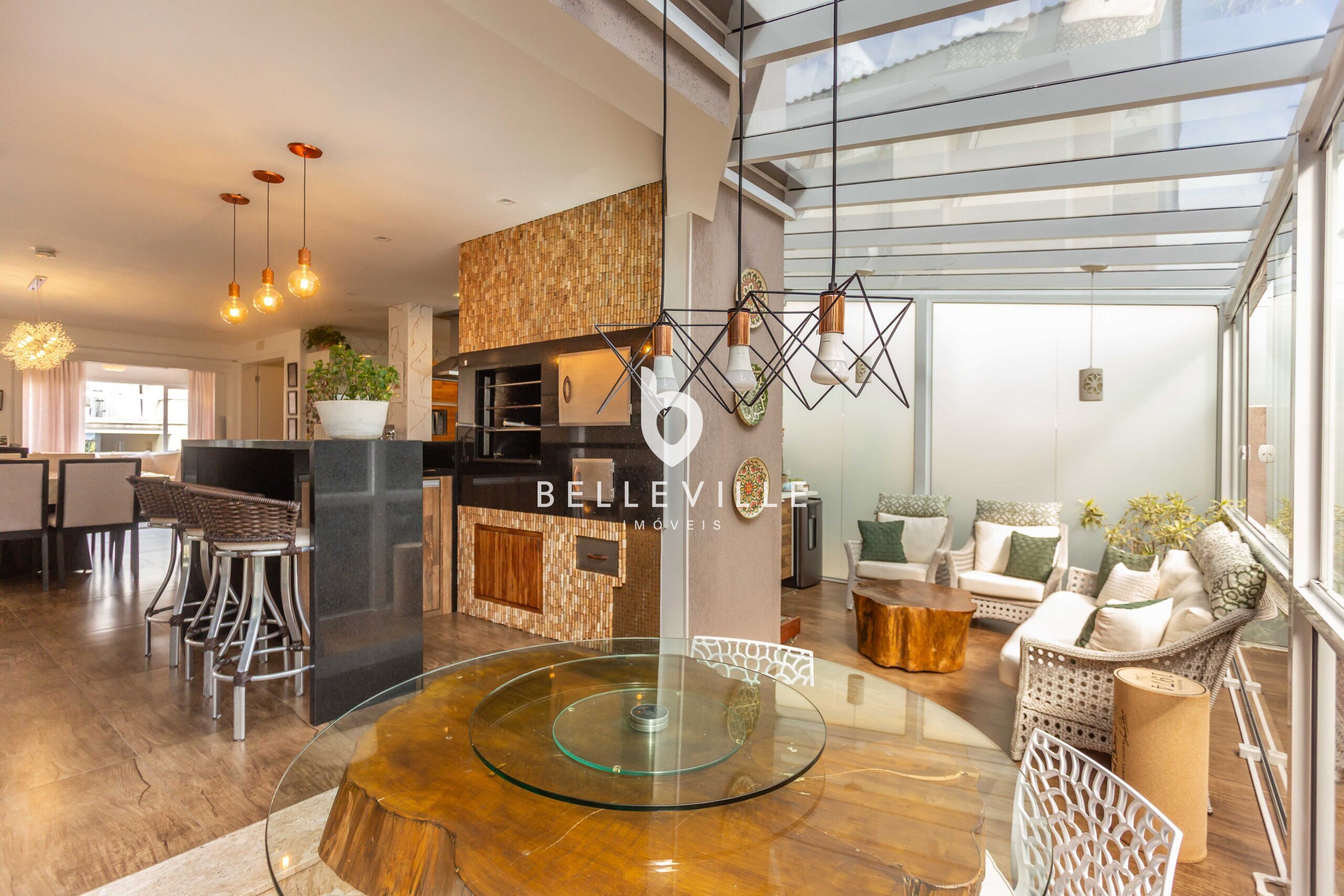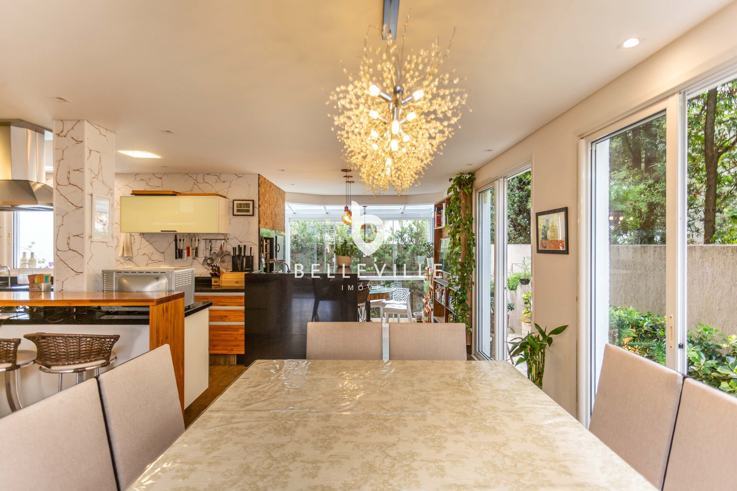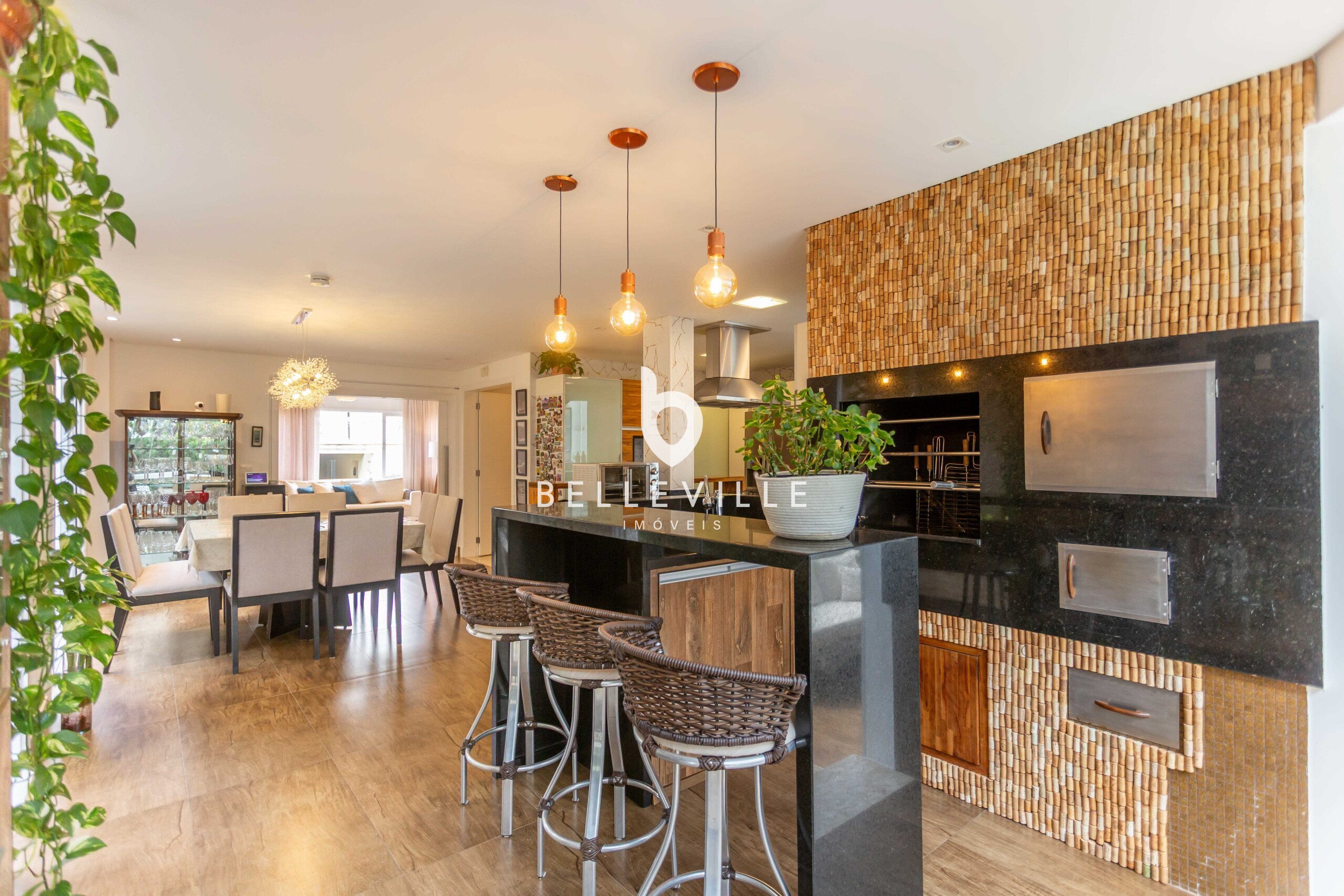 Ampla cozinha, totalmente equipada e rica em armários, integrada a sala de jantar, com mesa para 8 pessoas. Churrasqueira e forno de pizza integrados a cozinha, com espaço gourmet fechado com vidro.