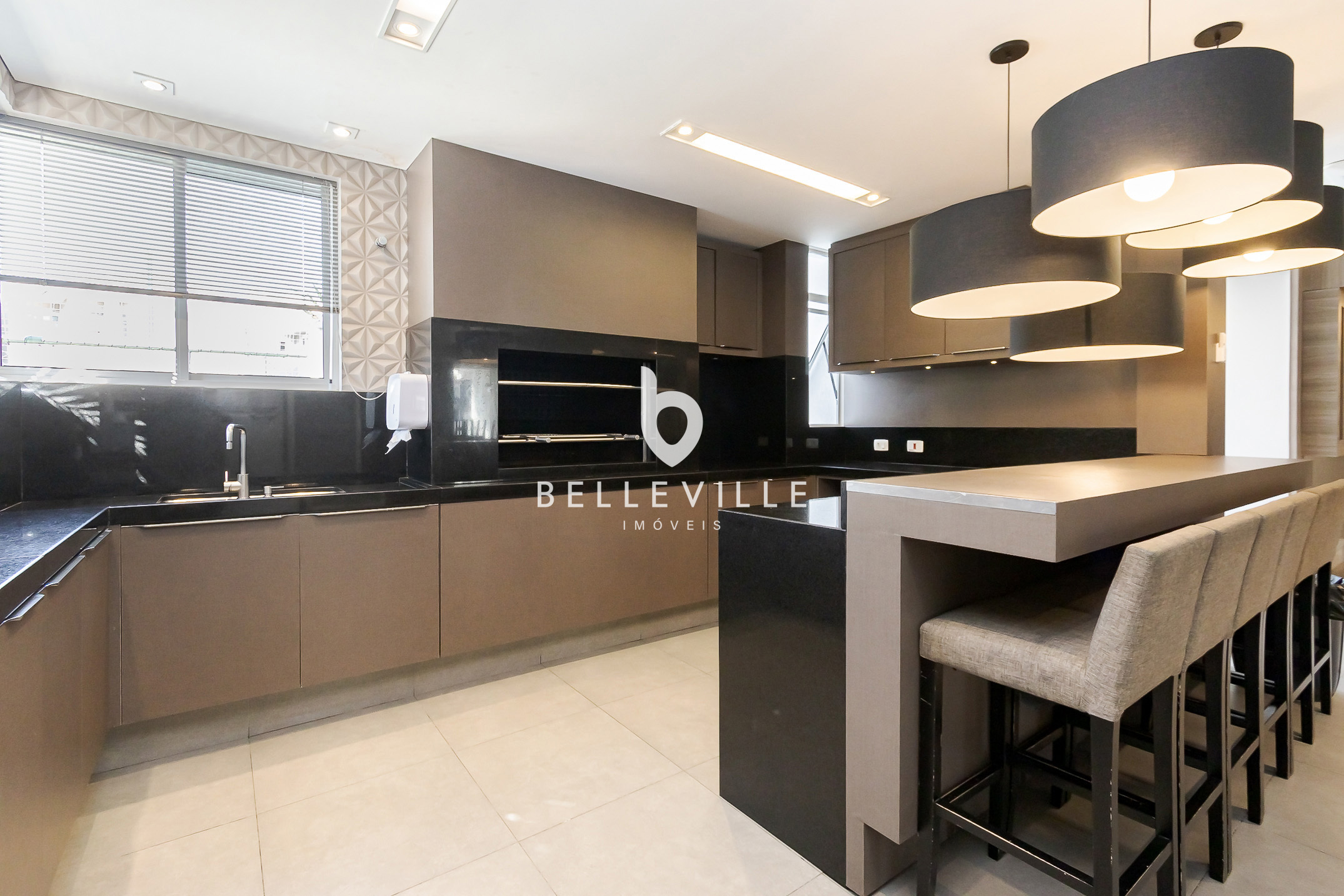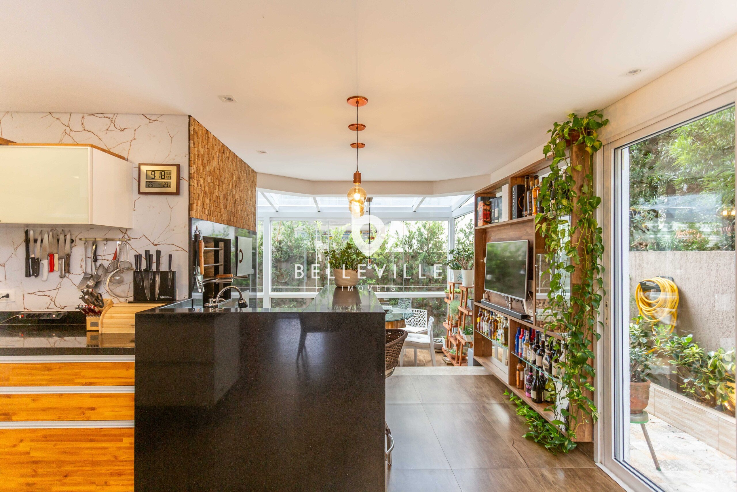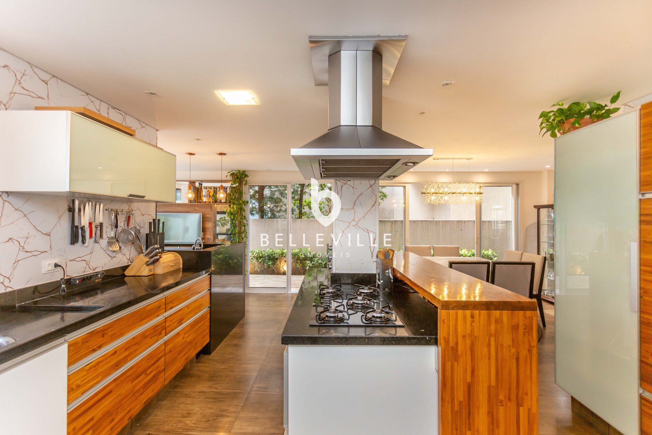 Ampla cozinha, totalmente equipada e rica em armários, integrada a sala de jantar, com mesa para 8 pessoas. Churrasqueira e forno de pizza integrados a cozinha, com espaço gourmet fechado com vidro.