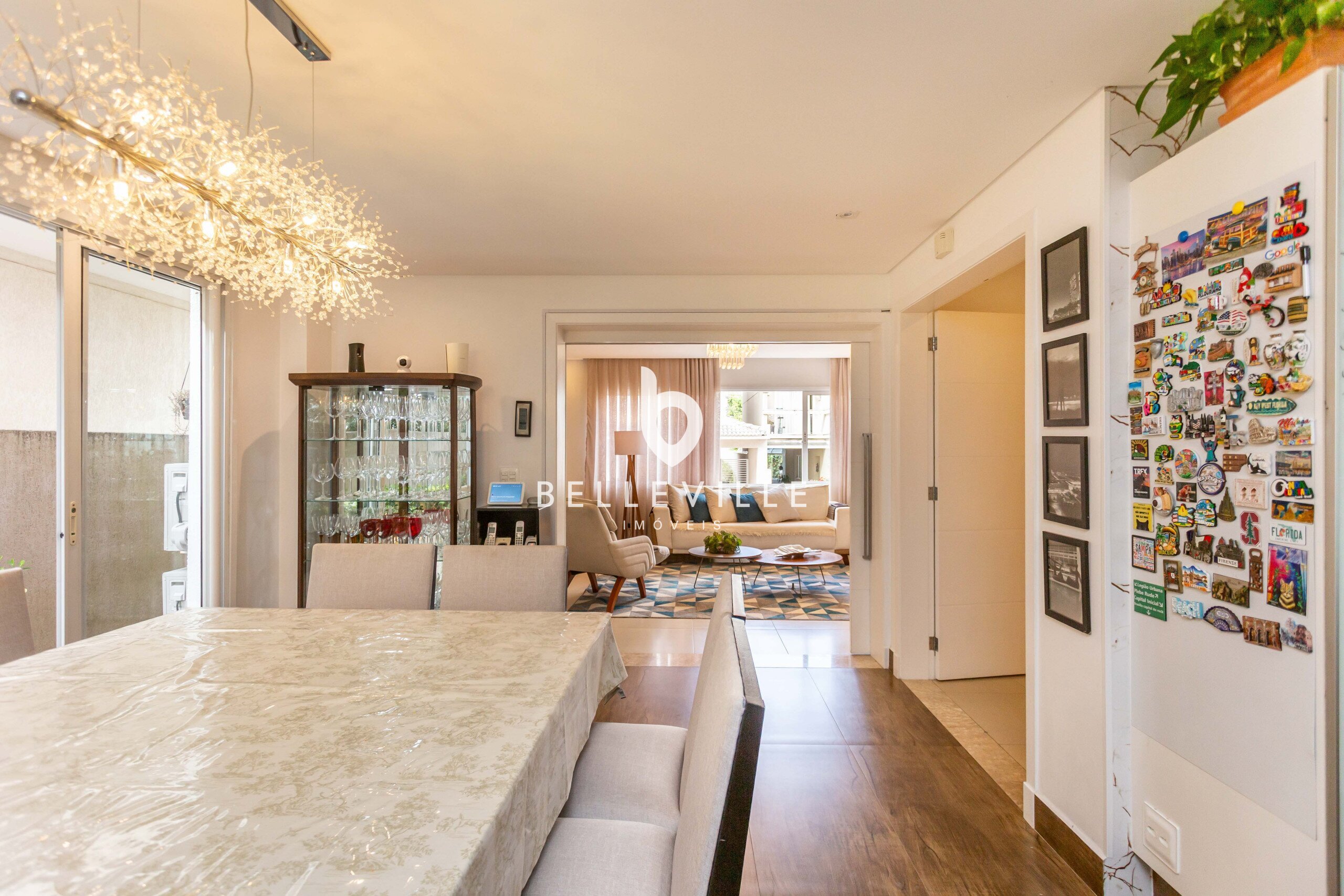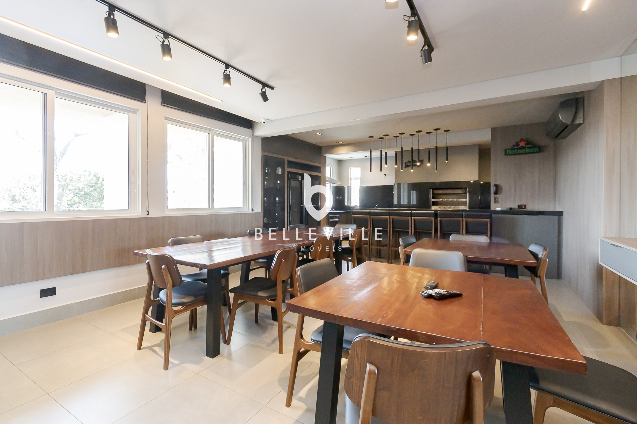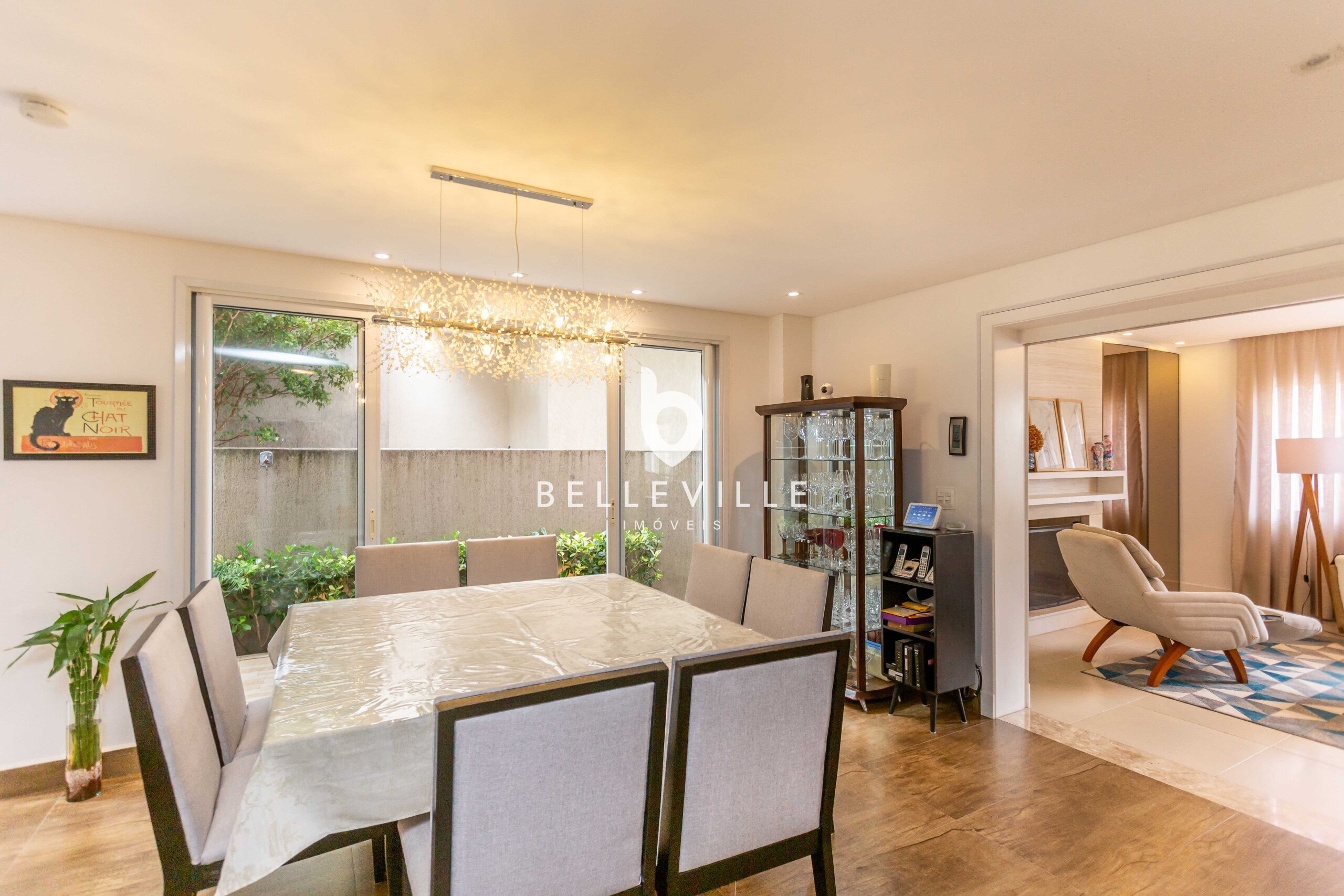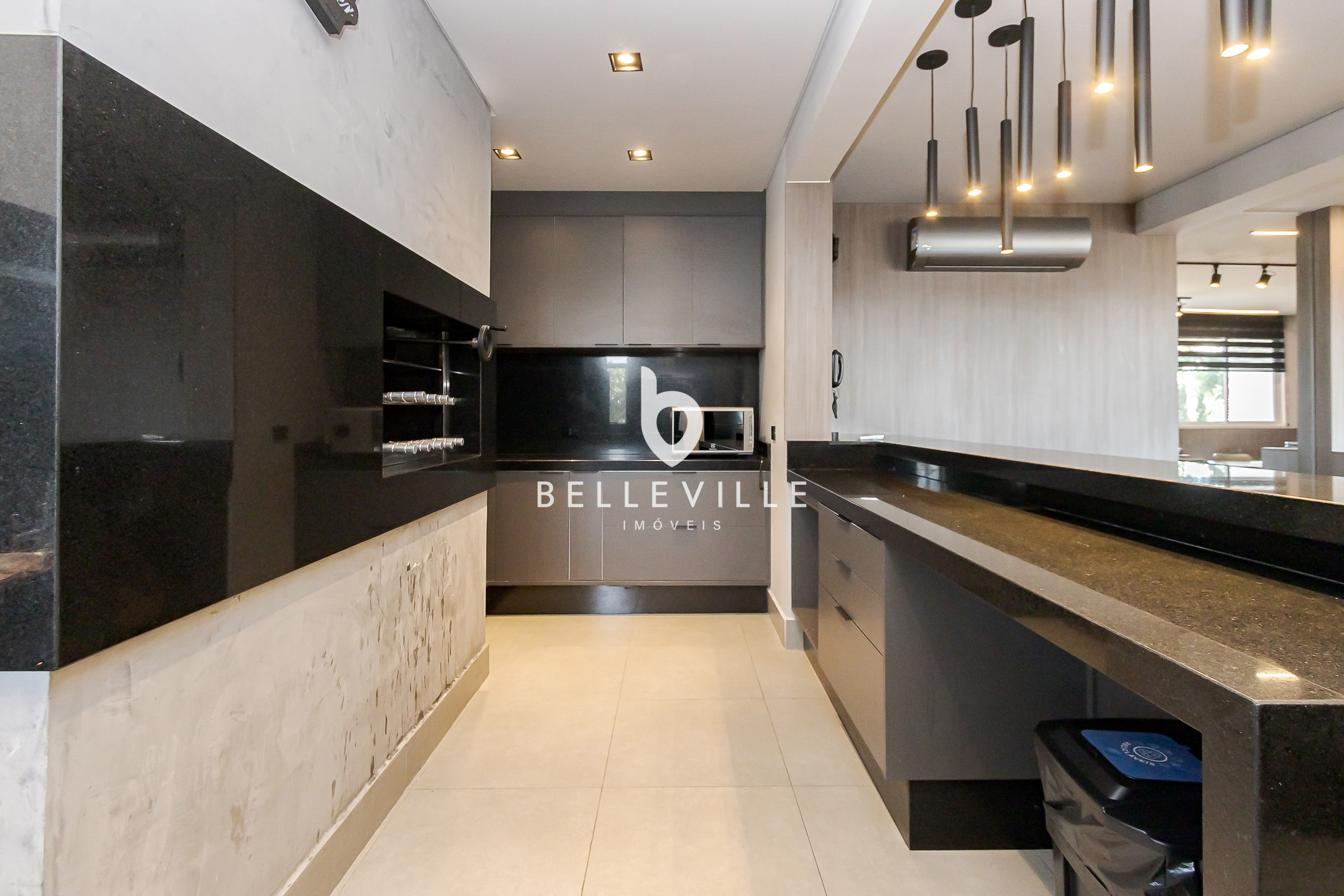 Ampla cozinha, totalmente equipada e rica em armários, integrada a sala de jantar, com mesa para 8 pessoas. Churrasqueira e forno de pizza integrados a cozinha, com espaço gourmet fechado com vidro.