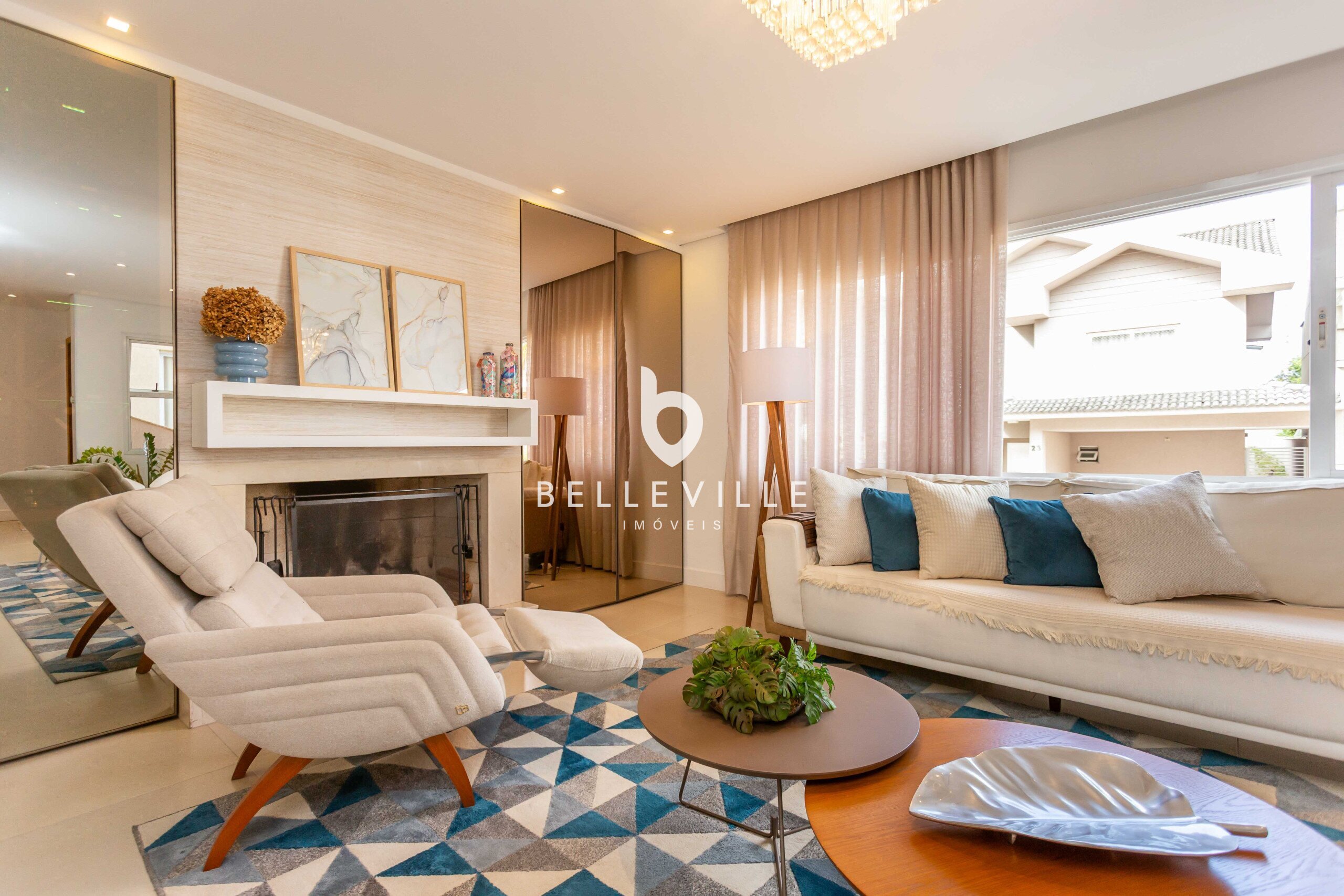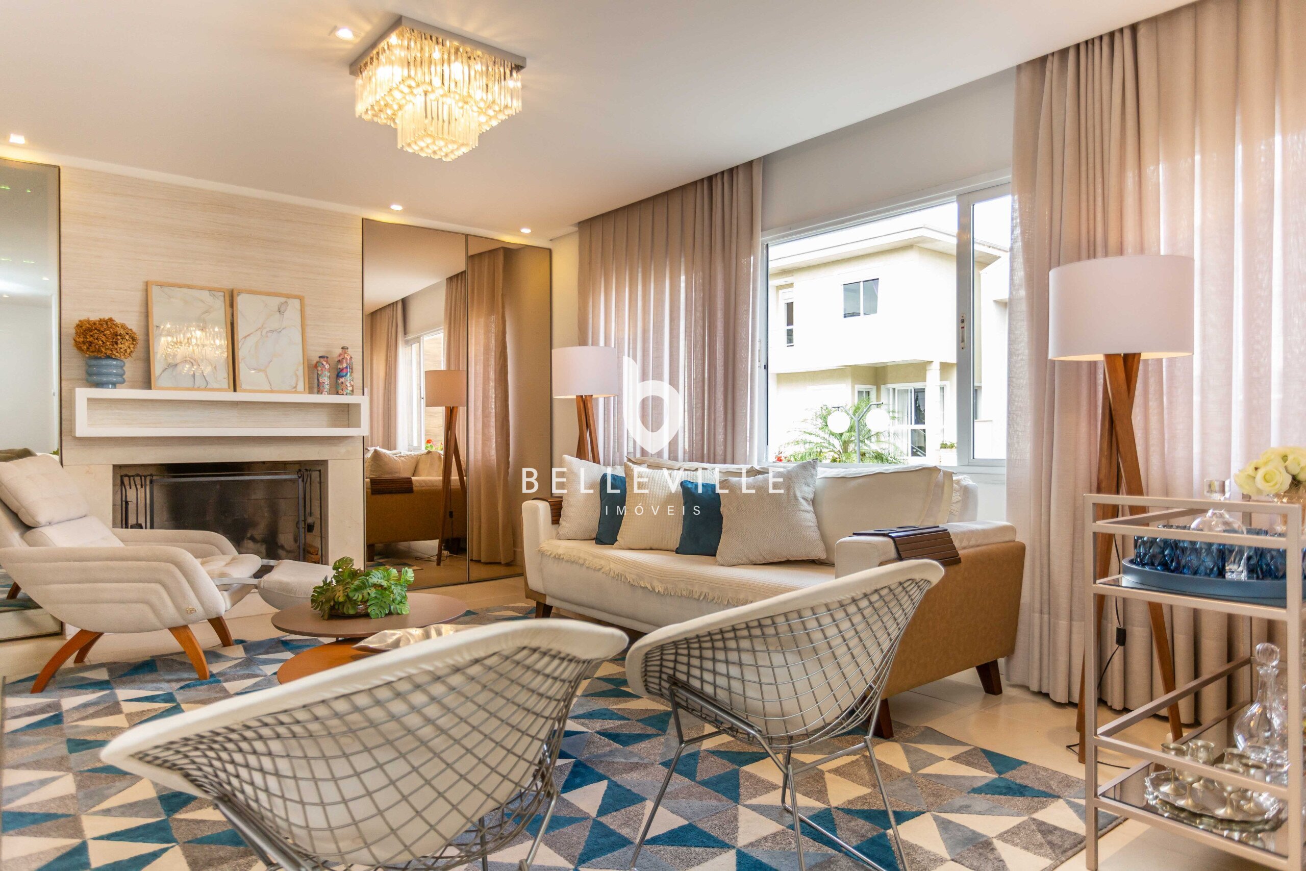 Sala de Estar integrada ao piso térreo, com lareira, adega e lavabo com pia com design exclusivo.