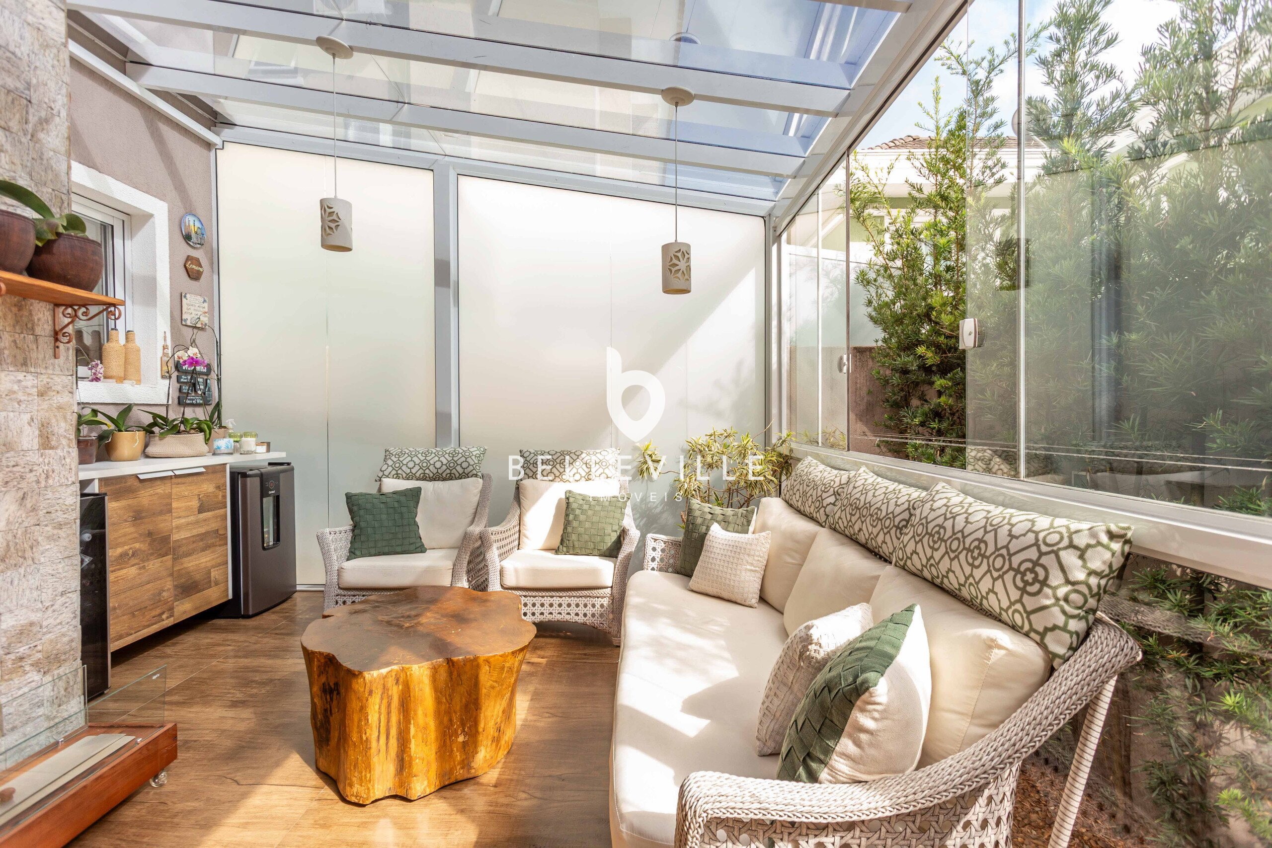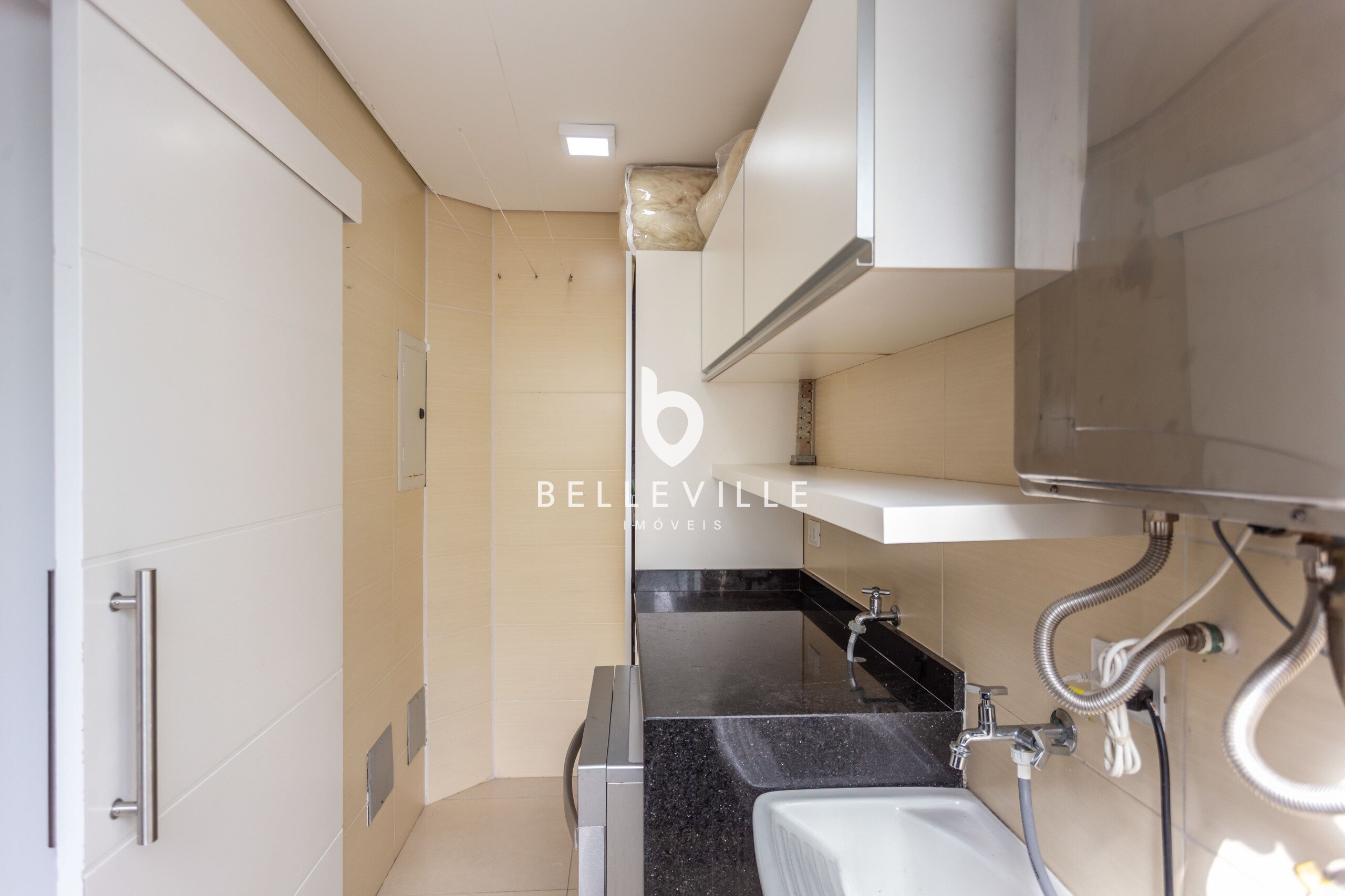 Área de serviço com armários, fechada com vidro para secagem de roupas.