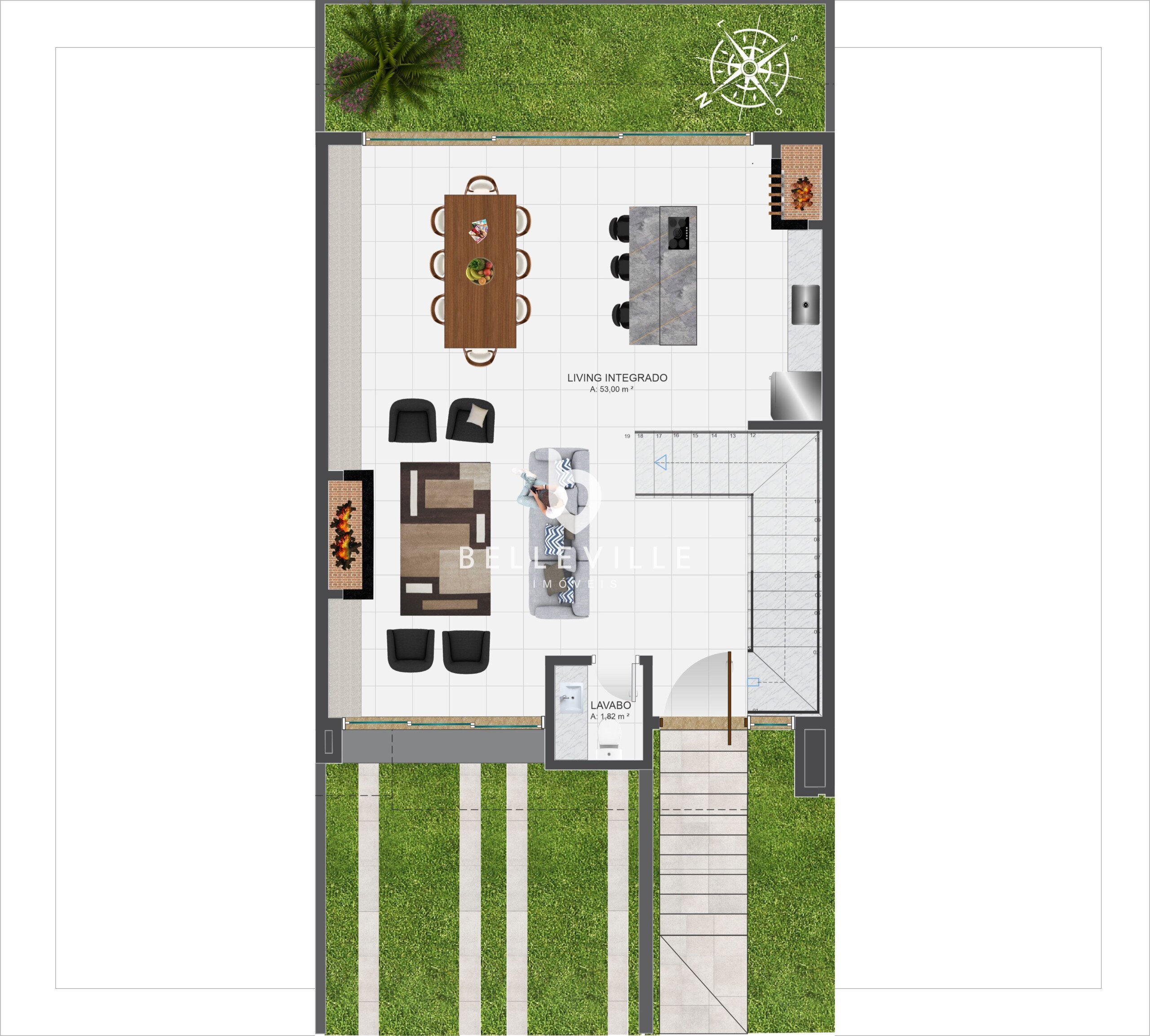 Com 194m² privativos, a casa conta com um projeto inteligente em conceito aberto, integrando os ambientes e proporcionando amplitude, excelente iluminação natural e fluidez nos espaços.