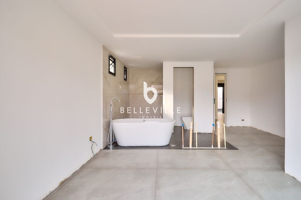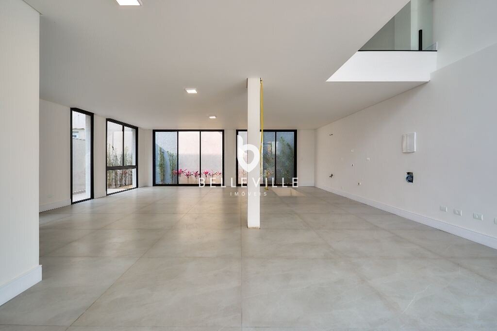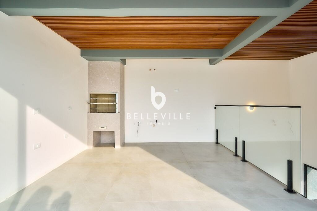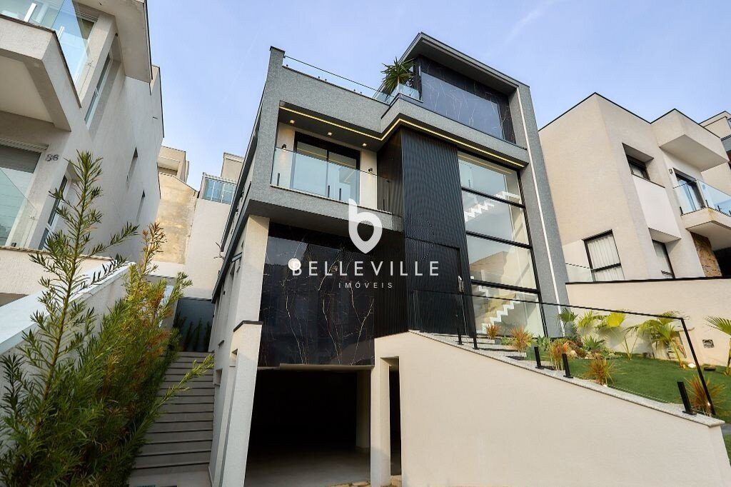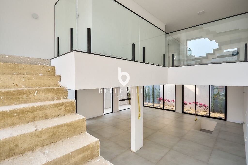 No pavimento térreo, conta com lavabo decorado, sala de TV com mezanino e revestimento em porcelanato, ripados em MDF com iluminação, bar integrado, salas de estar e jantar, cozinha e área gourmet com churrasqueira, entregue com acabamento em gesso, revestimentos, paisagismo e pontos elétricos e hidráulicos.