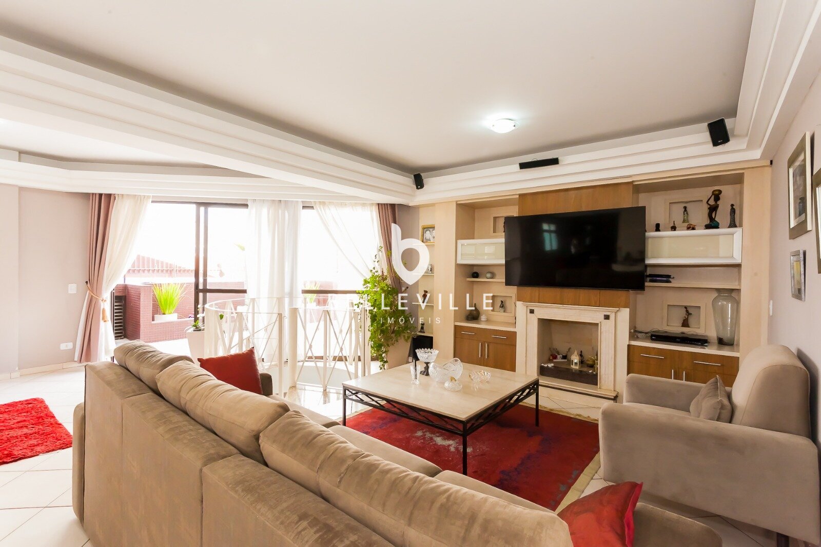 Living integrado com home theater e lareira