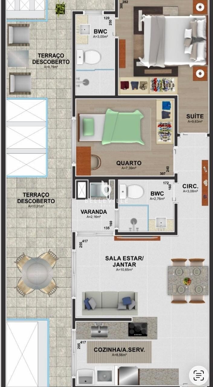 Os acabamentos incluem piso porcelanato nas áreas frias e piso laminado nos dormitórios, unindo praticidade e conforto térmico. O imóvel dispõe ainda de 1 vaga de garagem coberta.