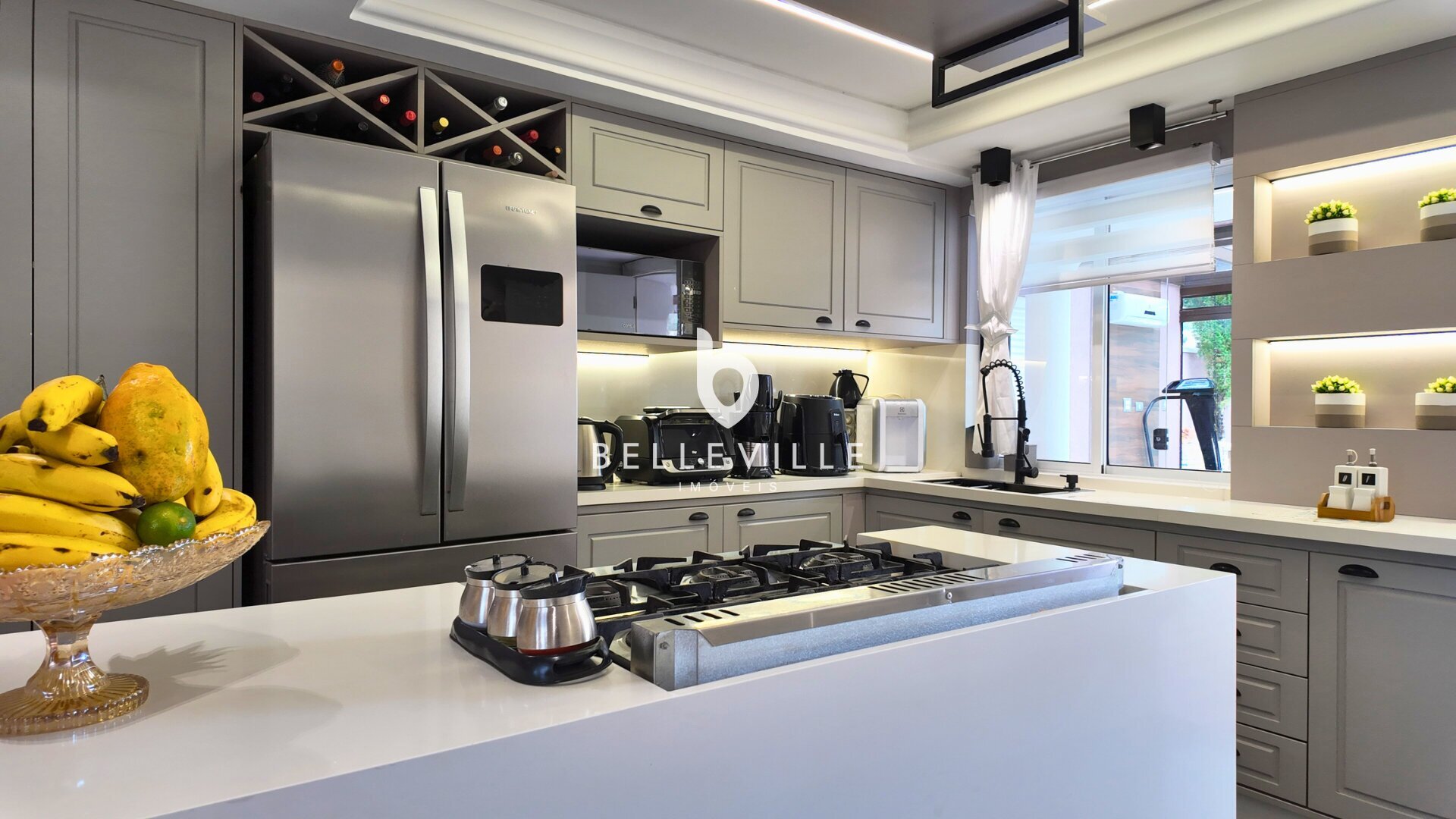 • Cozinha planejada premium, com fogão profissional e armários de altíssima qualidade, alinhando praticidade e design.